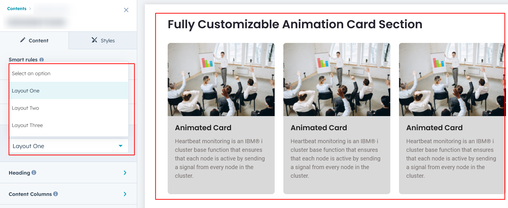 For Animated Cards, choose a layout (e.g., Layout 1, Layout 2, or Layout 3) and rearrange the cards to achieve the desired content flow and visual arrangement.