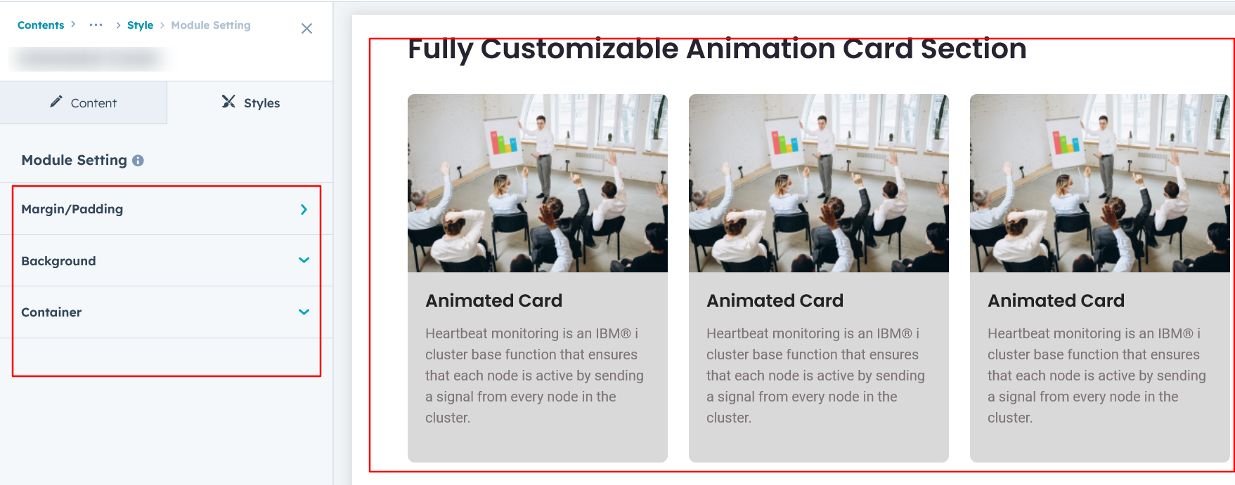 Adjust the margins, padding, background colors, and container width to customize the module's appearance. This flexibility lets you refine the layout and aesthetics, creating a visually appealing, functional, and user-friendly design.