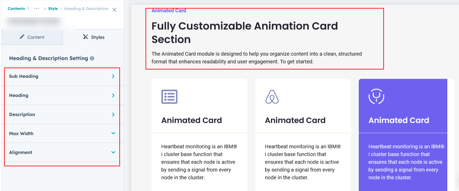 Easily customize the content in your module by modifying the "Heading," "Description. You can also choose to hide the section if desired, giving you complete control over the presentation and functionality of your content.