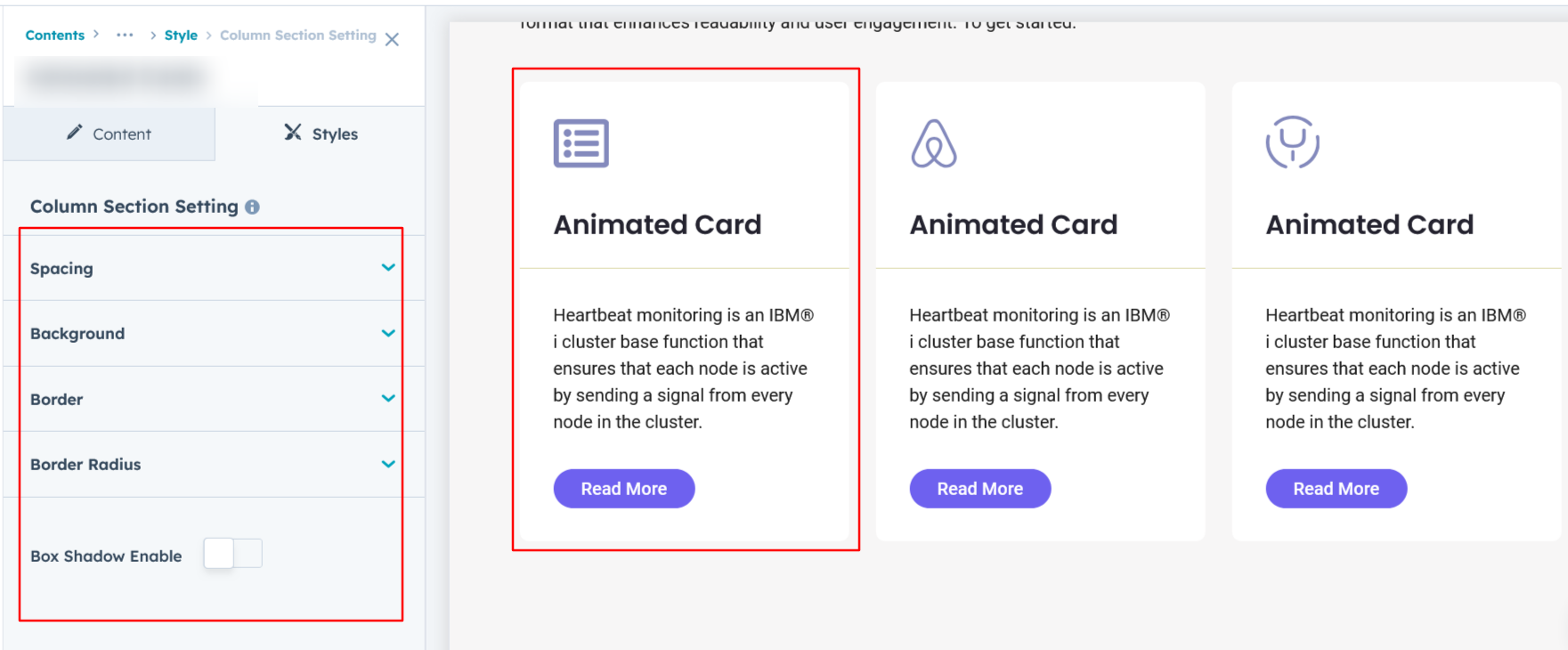Users can customize column spacing and adjust the background, border, border radius, and box shadow to create their desired design style.