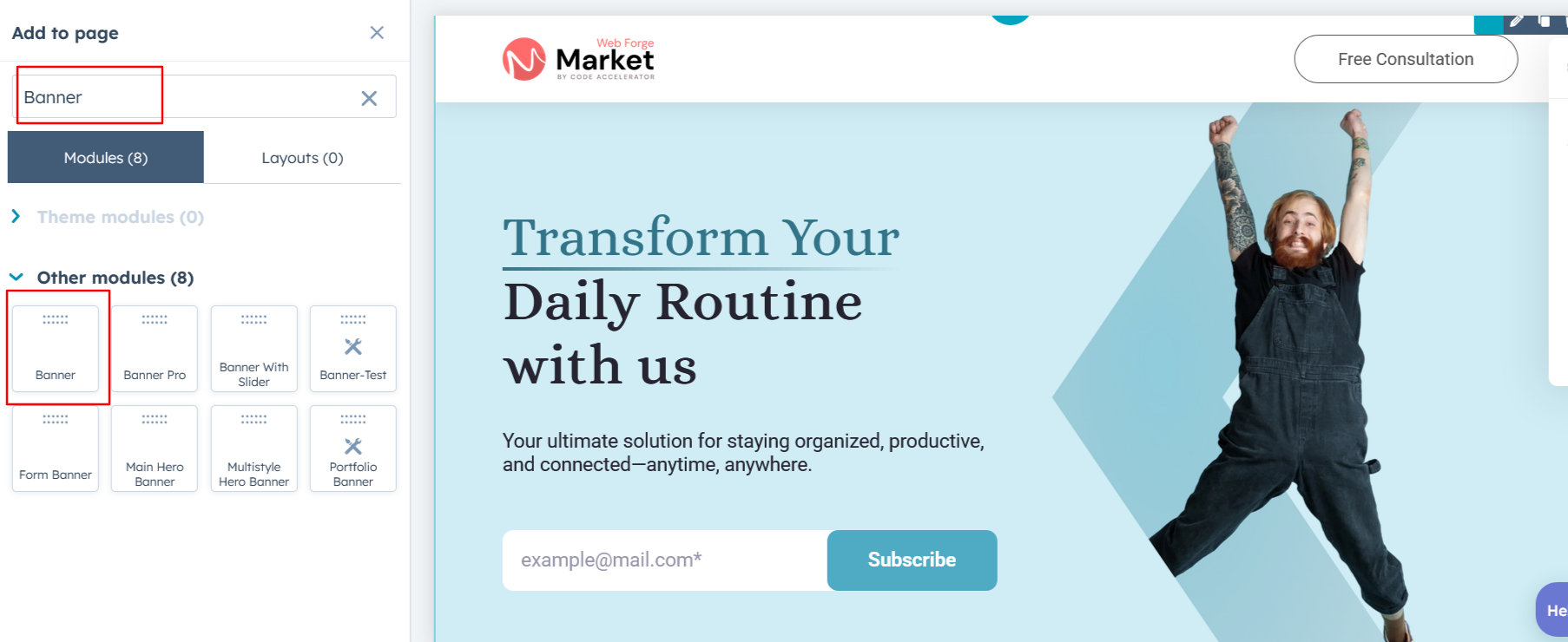 Search for "Banner" and drag and drop the module into the desired location on your page.