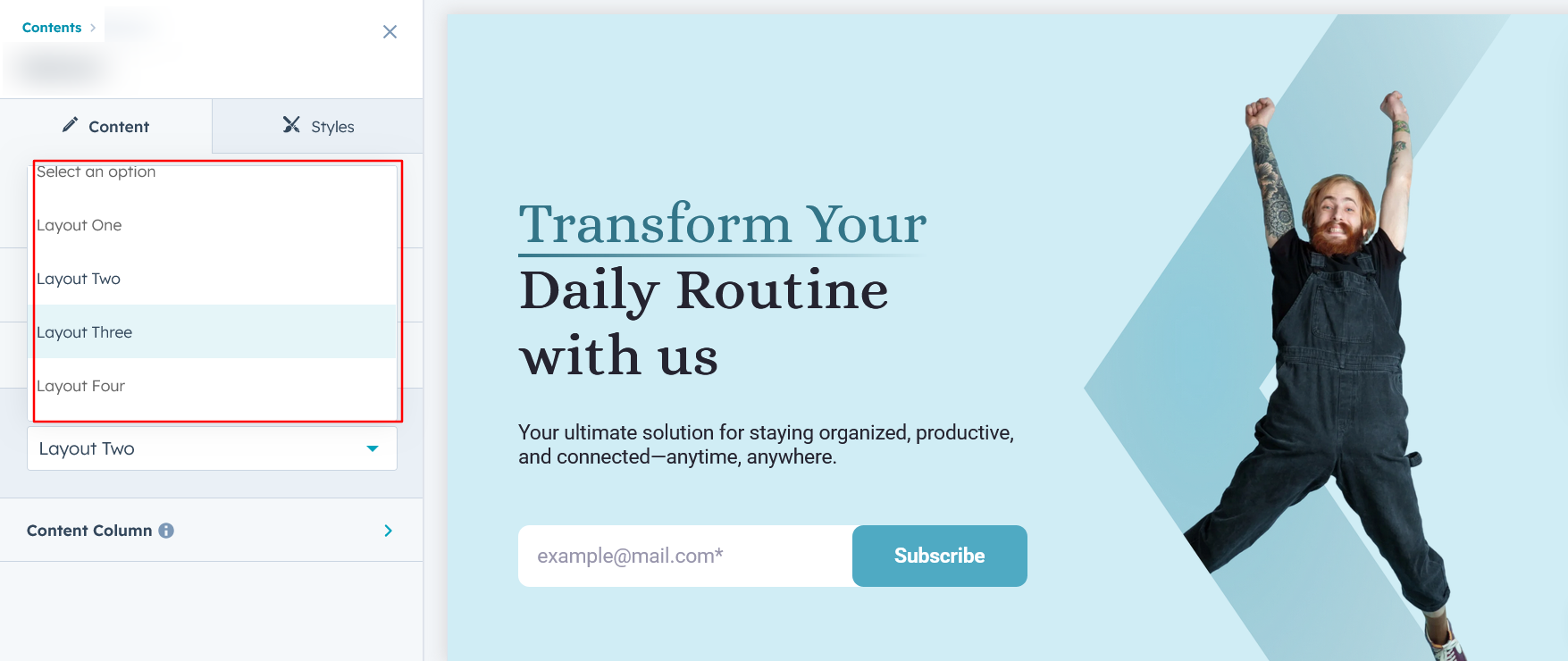 - Layout 2 : The layout features two columns: one containing a heading, description, and a subscribe form, and the other displaying an image, creating a balanced and engaging design.