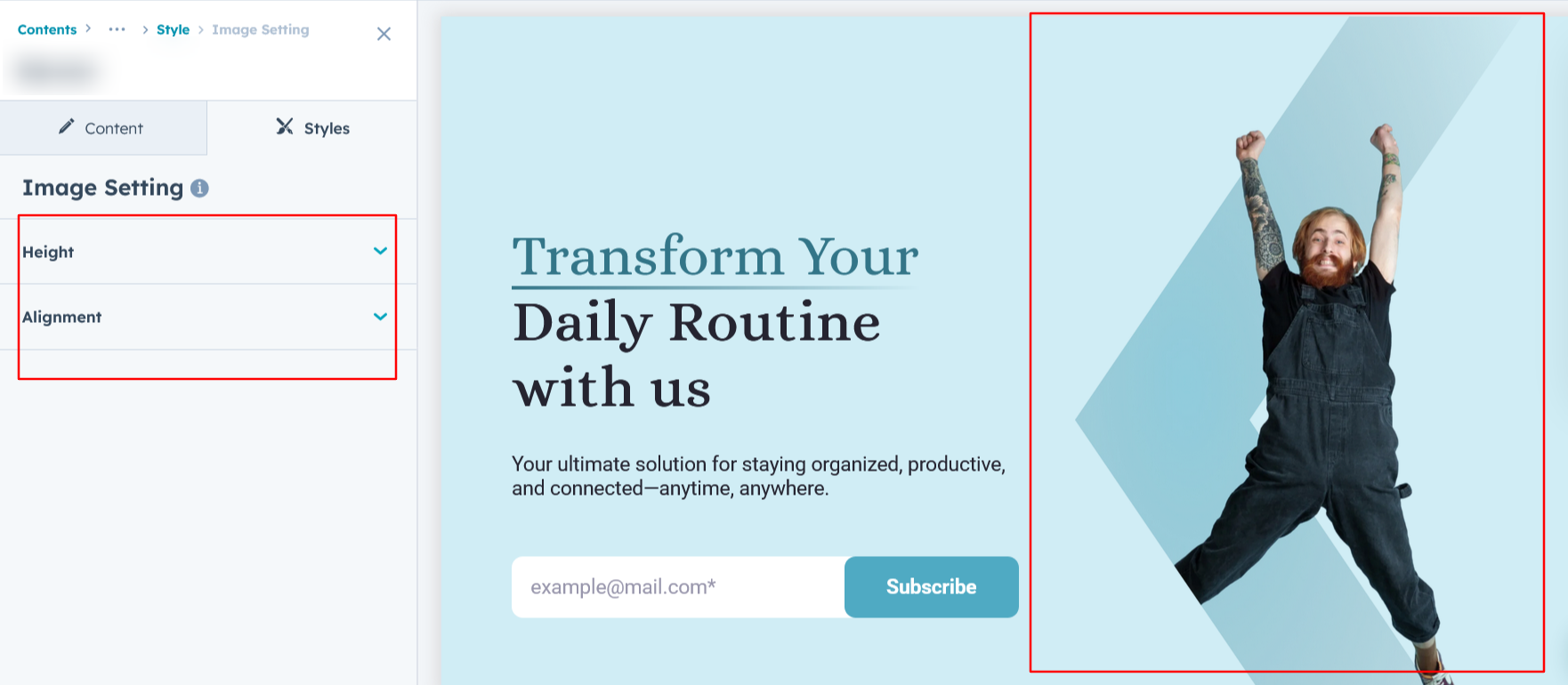 In Layout Two and Layout Three, you can customize the image by adjusting its height and alignment, ensuring it integrates seamlessly with your design and enhances visual appeal.