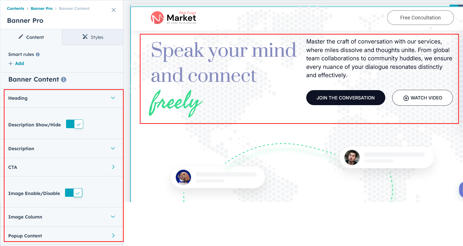 Easily customize all banner content, including the heading, description, CTA, image columns, popup content video options, and background video for a fully personalized and engaging design.