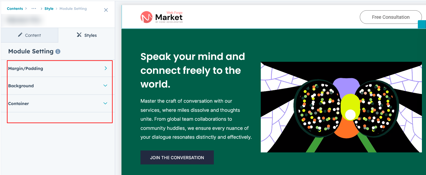 Adjust the margins, padding, background colors, and container width to achieve your desired look and feel for the module. This flexibility lets you fine-tune the layout and aesthetics, ensuring your design is both visually appealing and user-friendly.