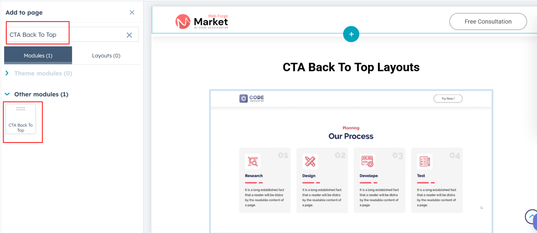 Search for "CTA Back To Top" and drag and drop the module into the desired location on your page.