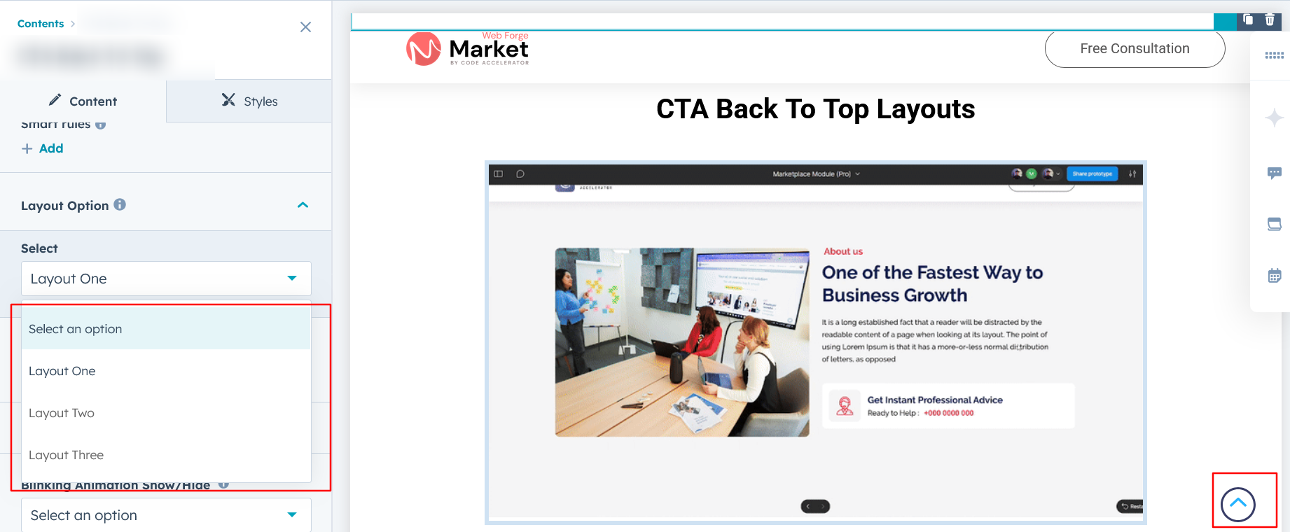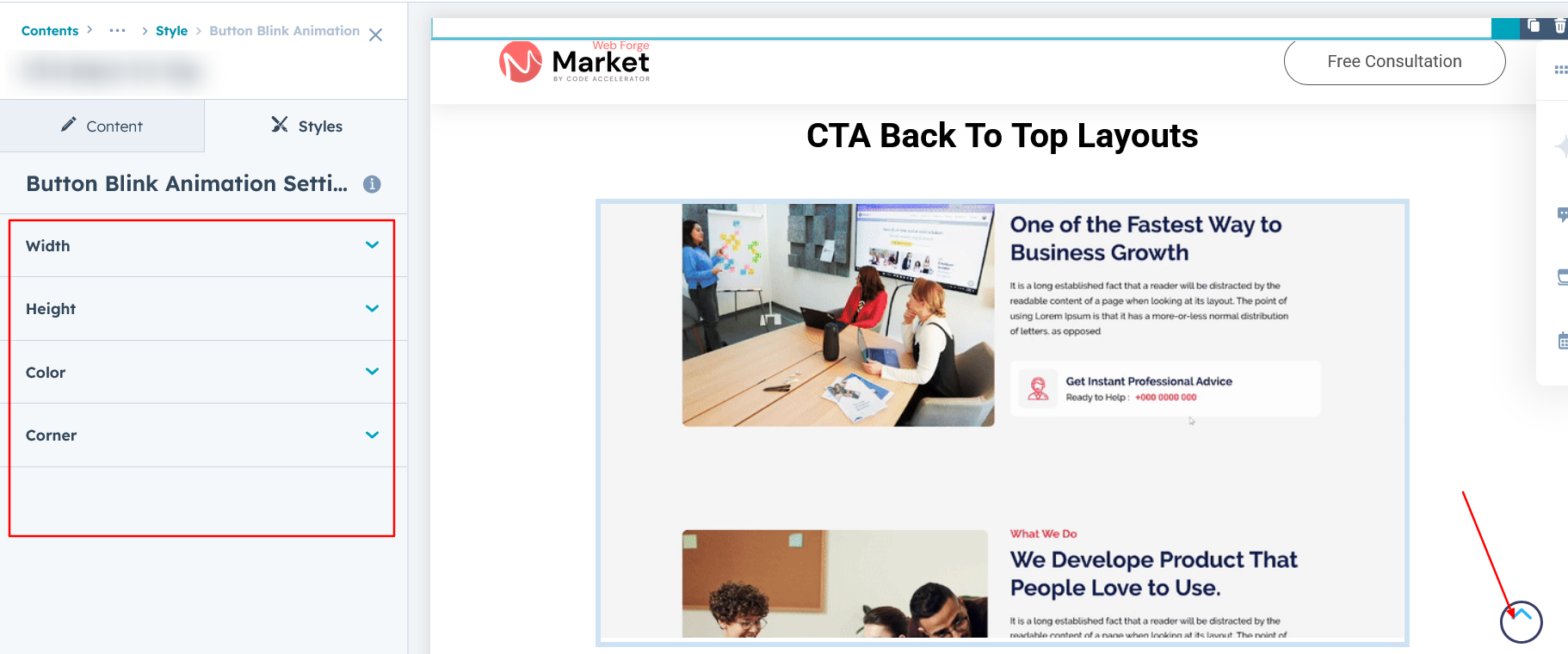In Layout One, the Button Blink Animation settings let you customize the height, width, color, and corner radius, ensuring a visually engaging effect that matches your design preferences.