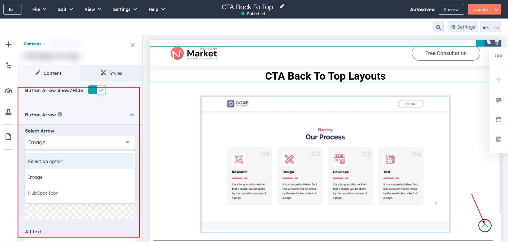 You can choose from various selection options, including an arrow icon, an arrow image, and the HubSpot icon. These elements help enhance navigation, improve visual appeal, and align with your branding. Whether you're guiding users through a process or emphasizing key actions, these icons provide a polished and professional touch to your content.
