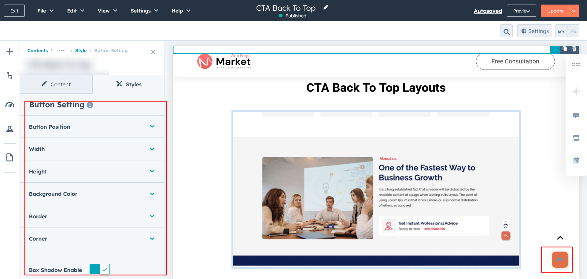 You can fully customize the button by adjusting its position, background color, height, width, border, box shadow, and corner radius, ensuring it aligns perfectly with your design and branding.