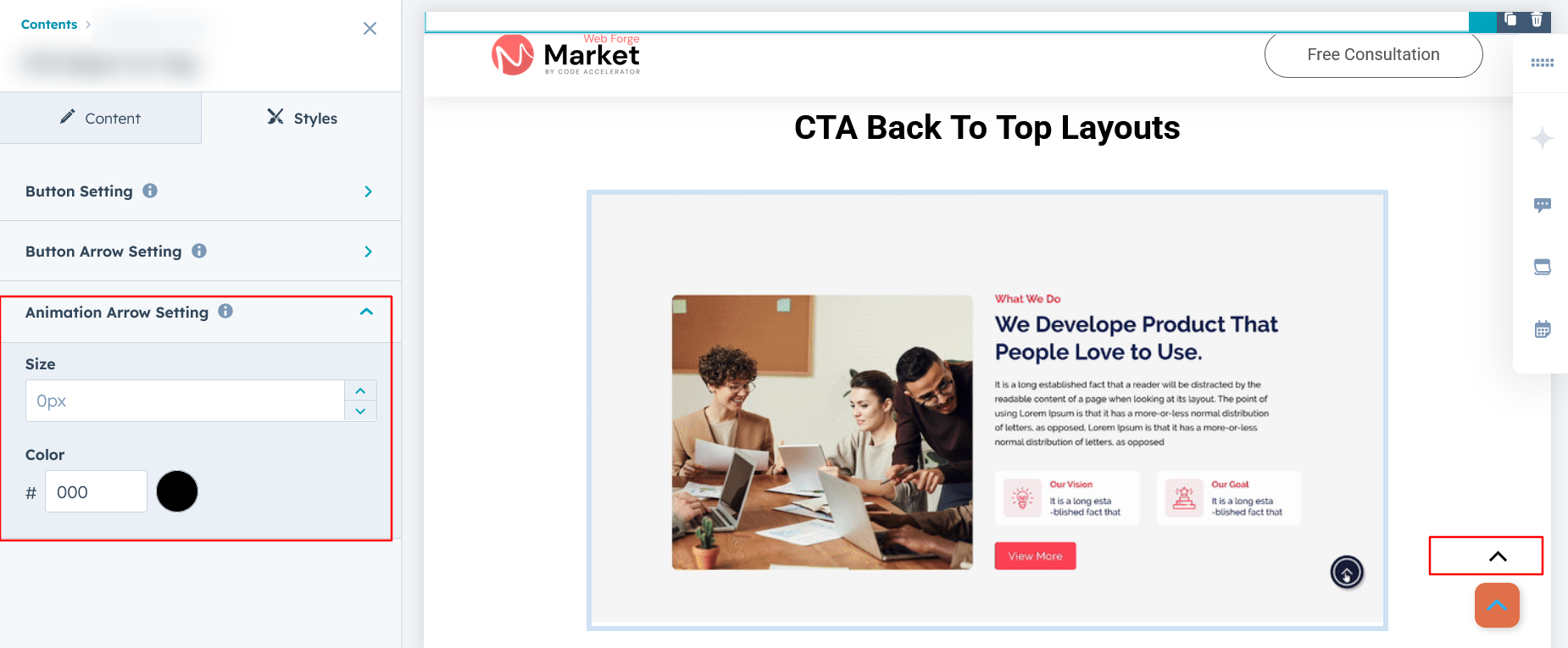 In Layout Two, you can customize the top animation arrow by adjusting its size and color, allowing you to enhance visibility and match your design style.