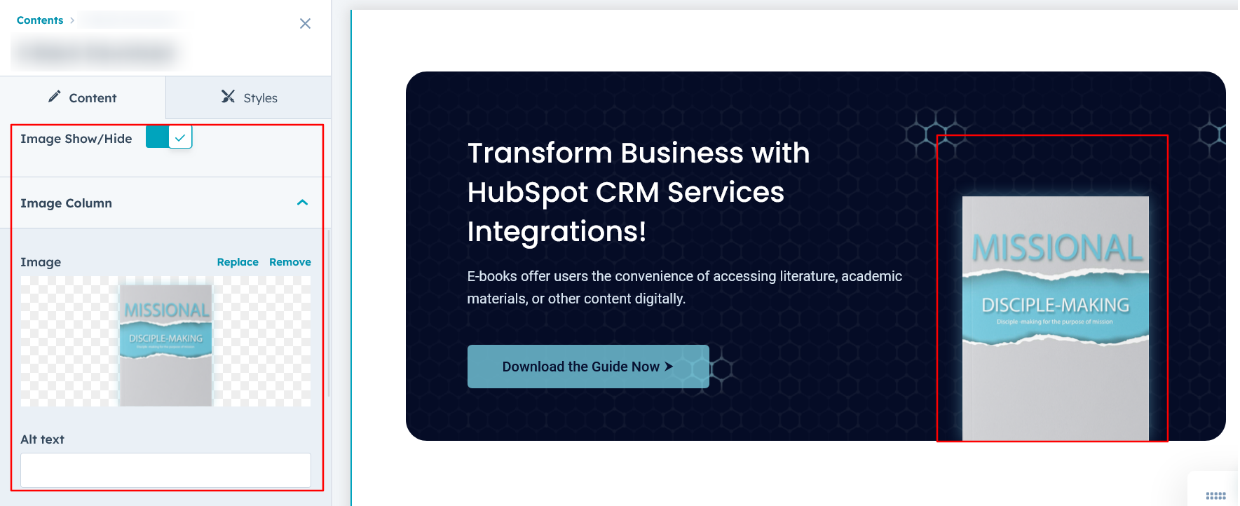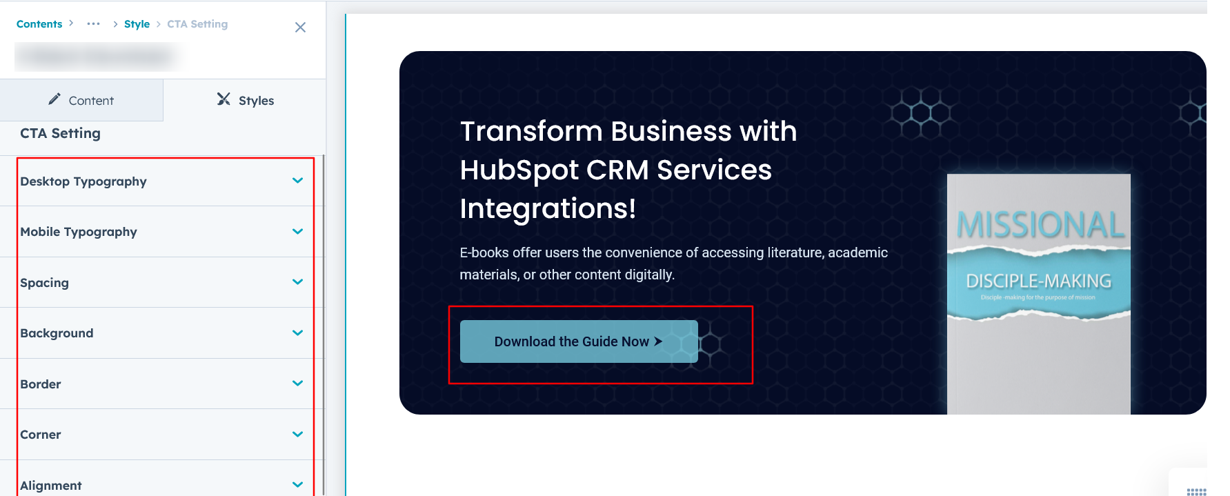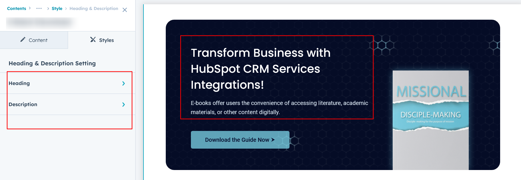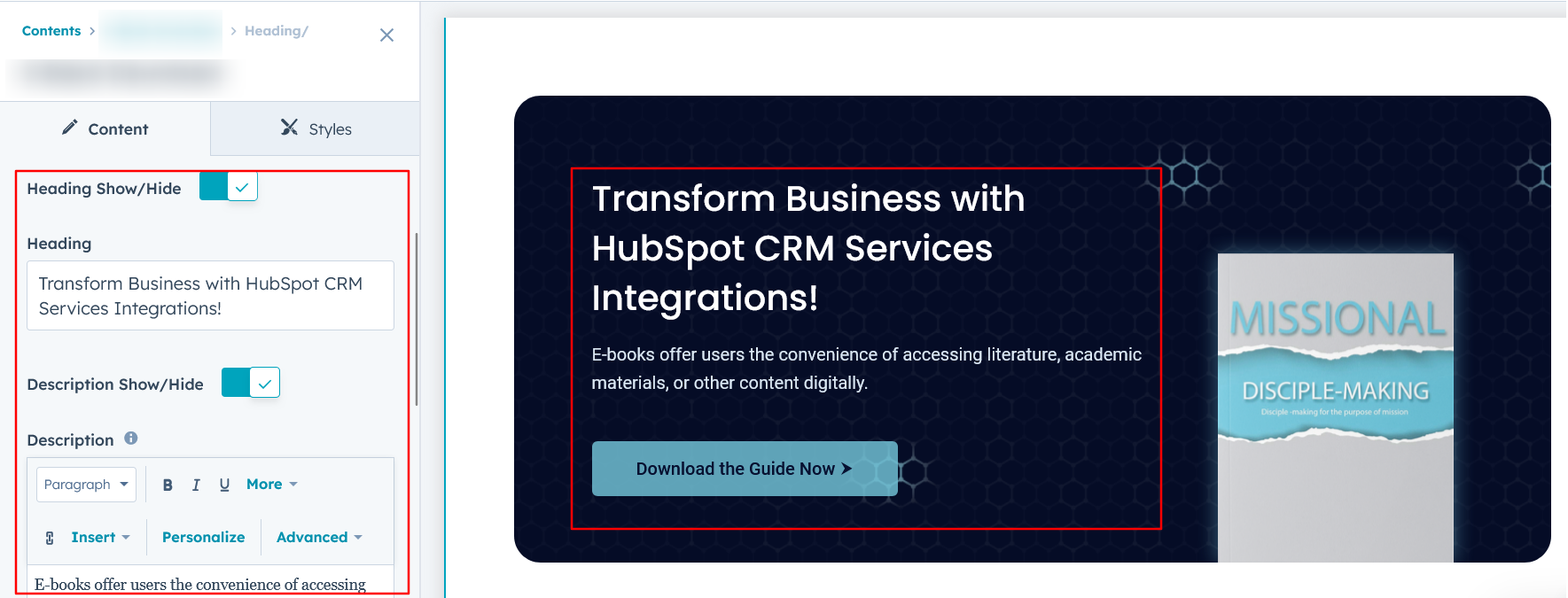 Easily customize the content in your module by modifying the "Heading," "Description," and call-to-action (CTA) to suit your needs. You can also choose to hide the section if desired, giving you complete control over the presentation and functionality of your content.