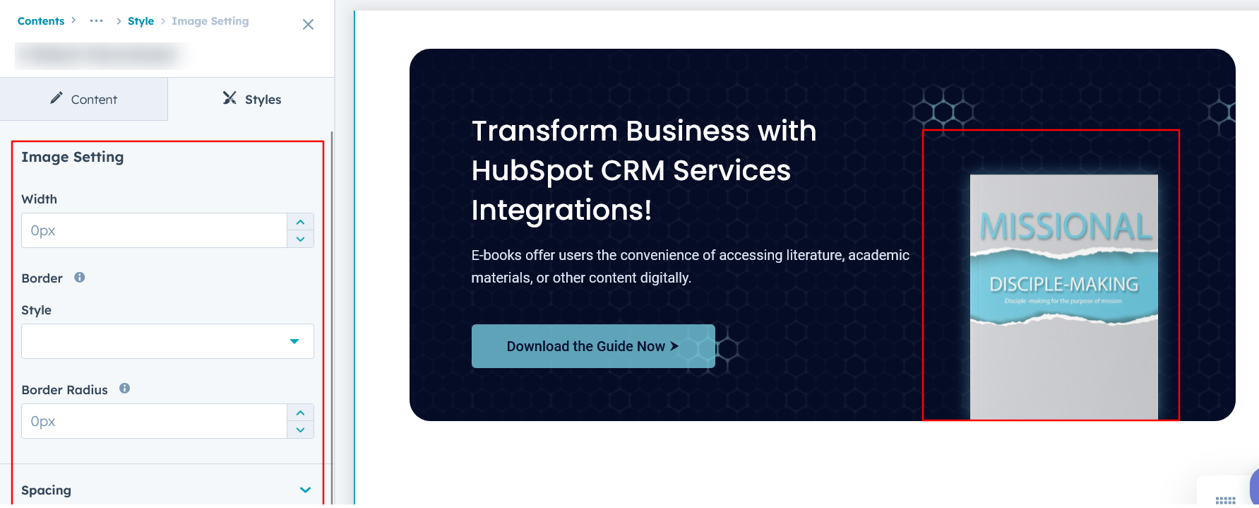 Users can customize the image width and, if desired, add borders and corner radius to the image. They can also adjust the spacing around the image to ensure it fits seamlessly within the overall design, enhancing visual coherence and presentation.
