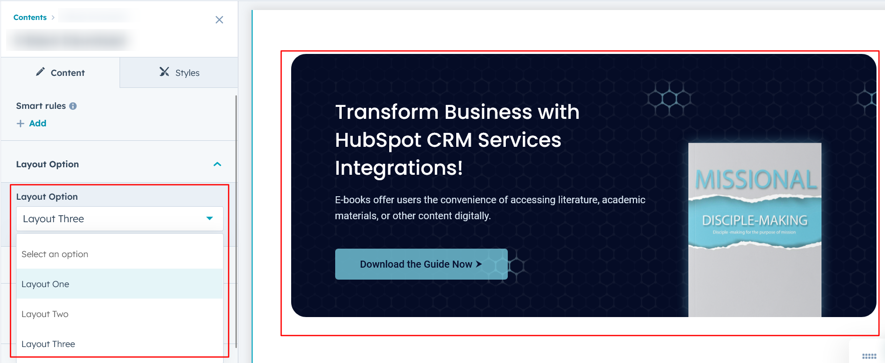 - Layout 1: The module features a two-column layout: the left side displays an engaging ebook image, while the right side includes a compelling heading, a concise description, and a clear call-to-action (CTA).
