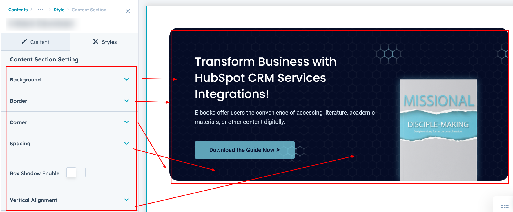 Users can customize the E-Book section's background color, vertical alignment, border, corner radius, and spacing for both desktop and mobile views. This ensures a tailored design experience that maintains consistency and visual appeal across all devices.