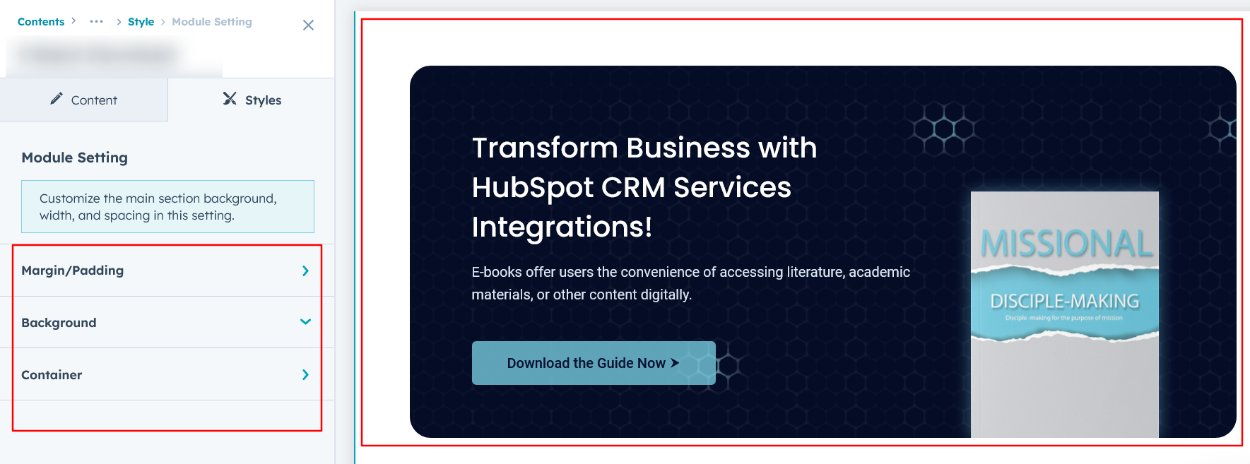 Adjust the margins, padding, background colors, and container width to create the desired look and feel for your module. This flexibility allows you to fine-tune the layout and aesthetics, ensuring that your design is both visually appealing and functional.