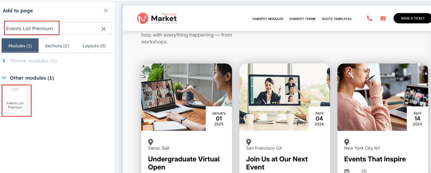 Search for "Events List Premium" and drag and drop the module into the desired location on your page.