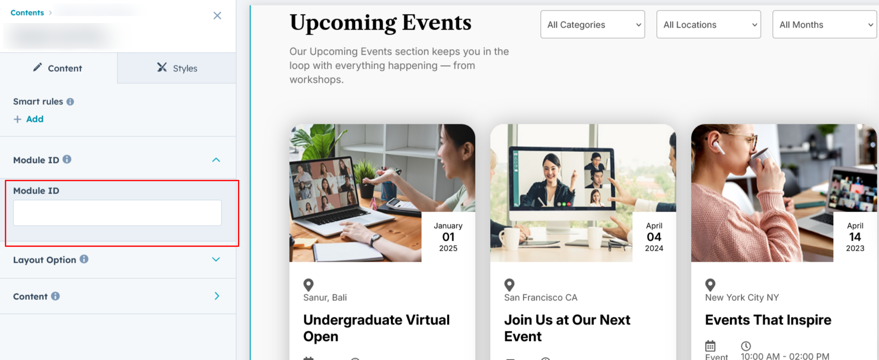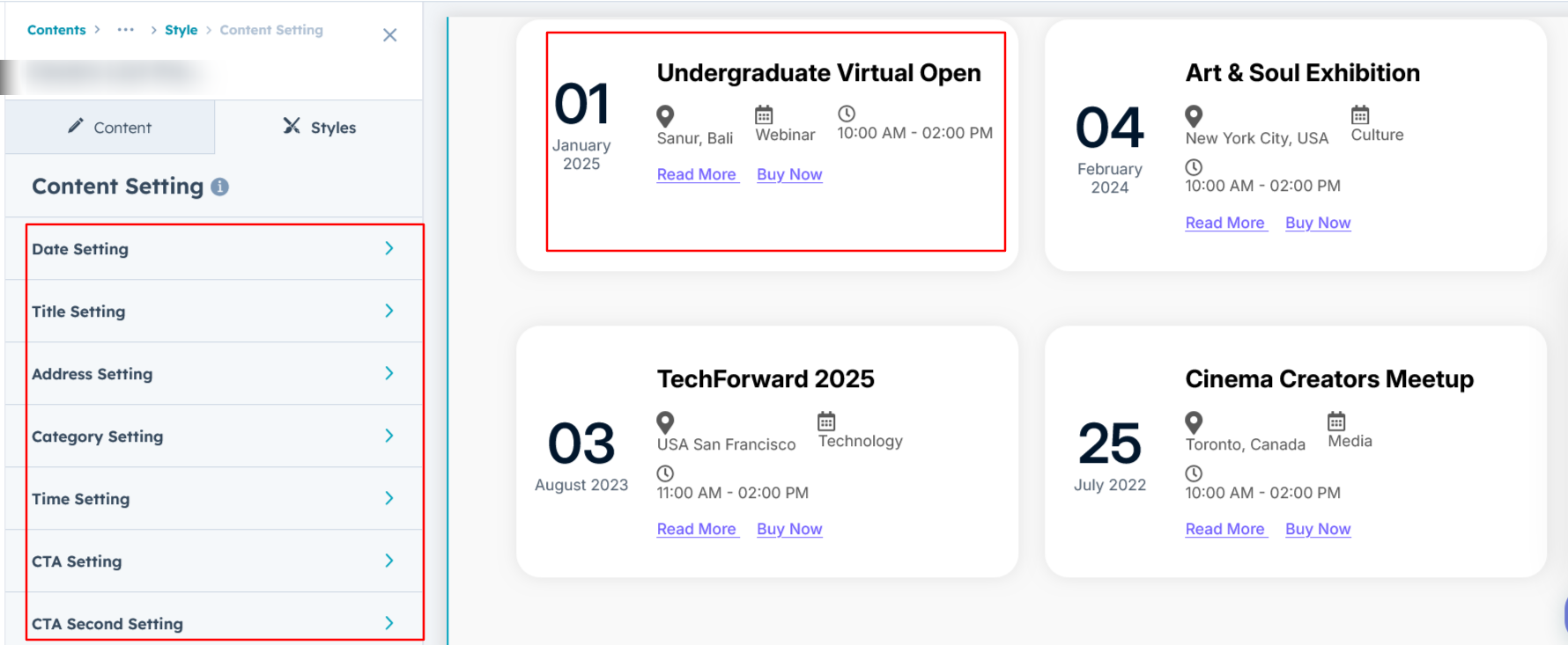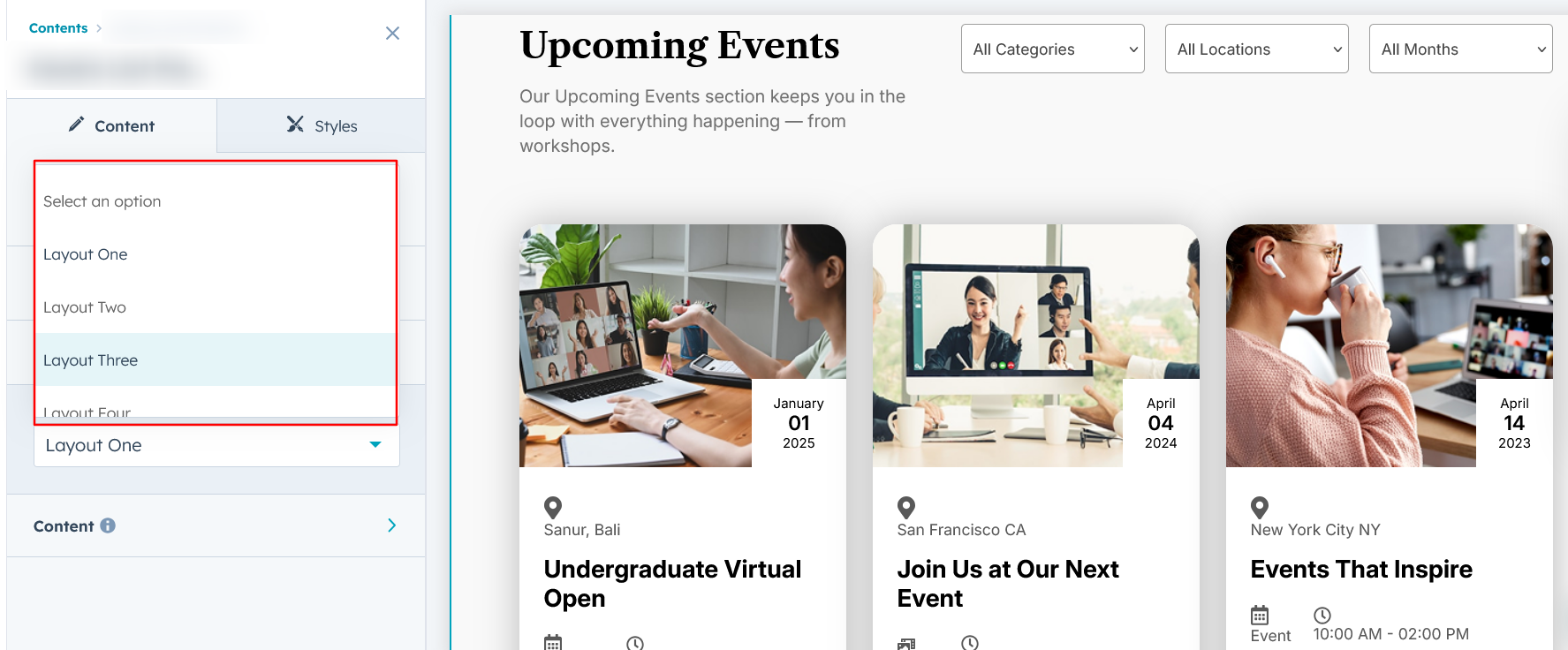 For the Event list, select your preferred layout (e.g., Layout 1, Layout 2, Layout 3 or Layout 4). Easily rearrange event cards within the chosen layout to achieve the perfect content flow and visual arrangement, ensuring a seamless and engaging user experience.