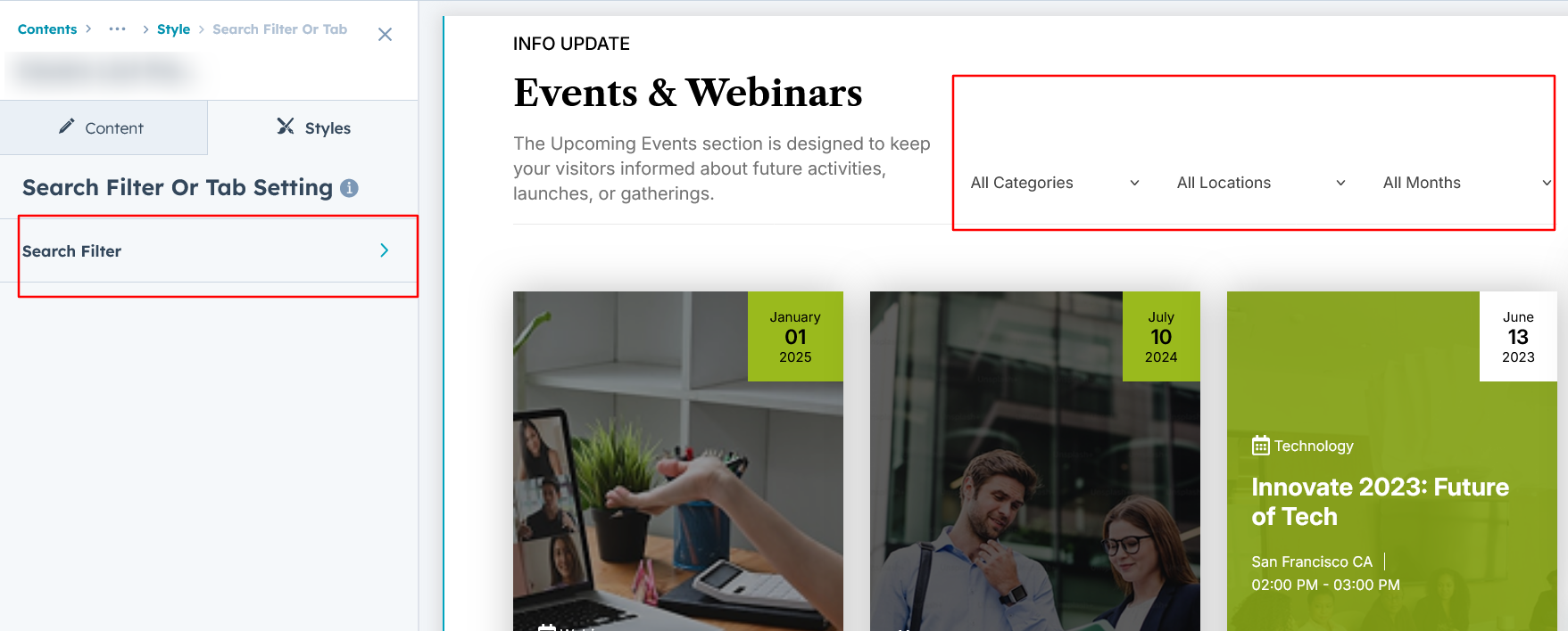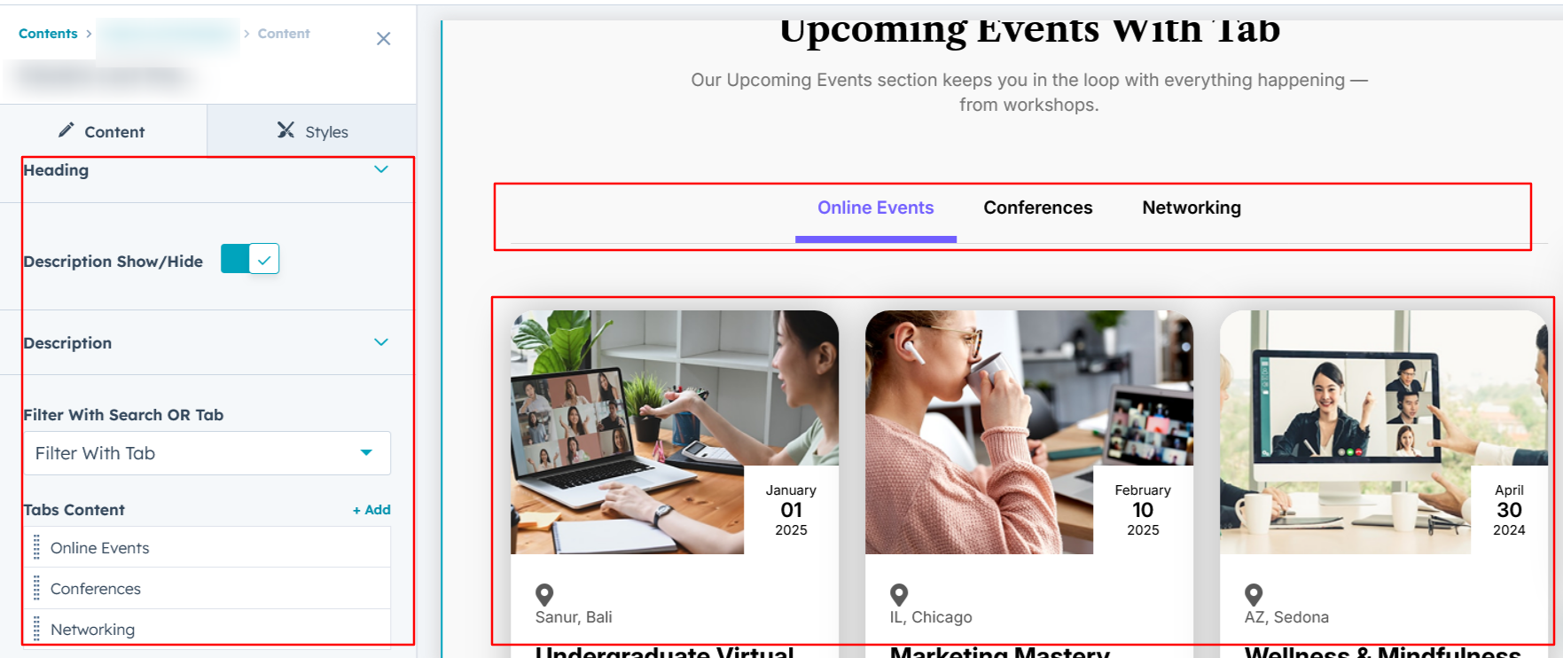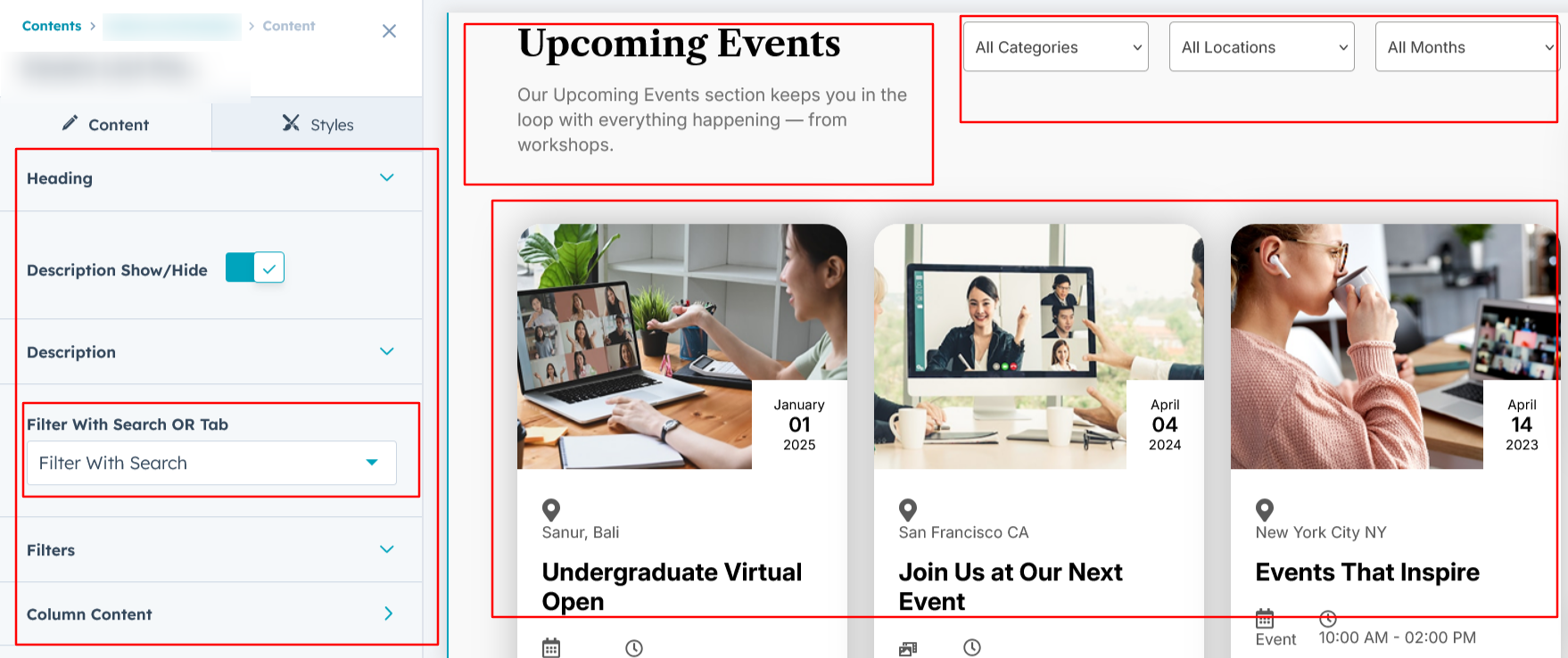 You can easily update the heading and description, customize the column content to match your needs, and choose between tab or filter options for a more dynamic and user-friendly content display.
