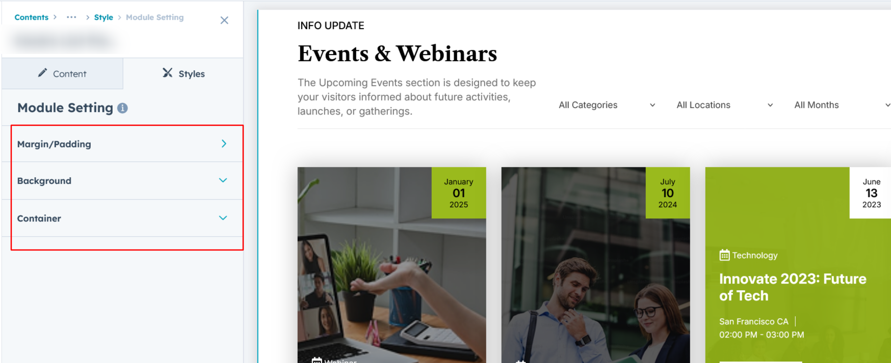 Adjust the margins, padding, background colors, and container width to achieve your desired look and feel for the module. This flexibility lets you fine-tune the layout and aesthetics, ensuring your design is both visually appealing and user-friendly.