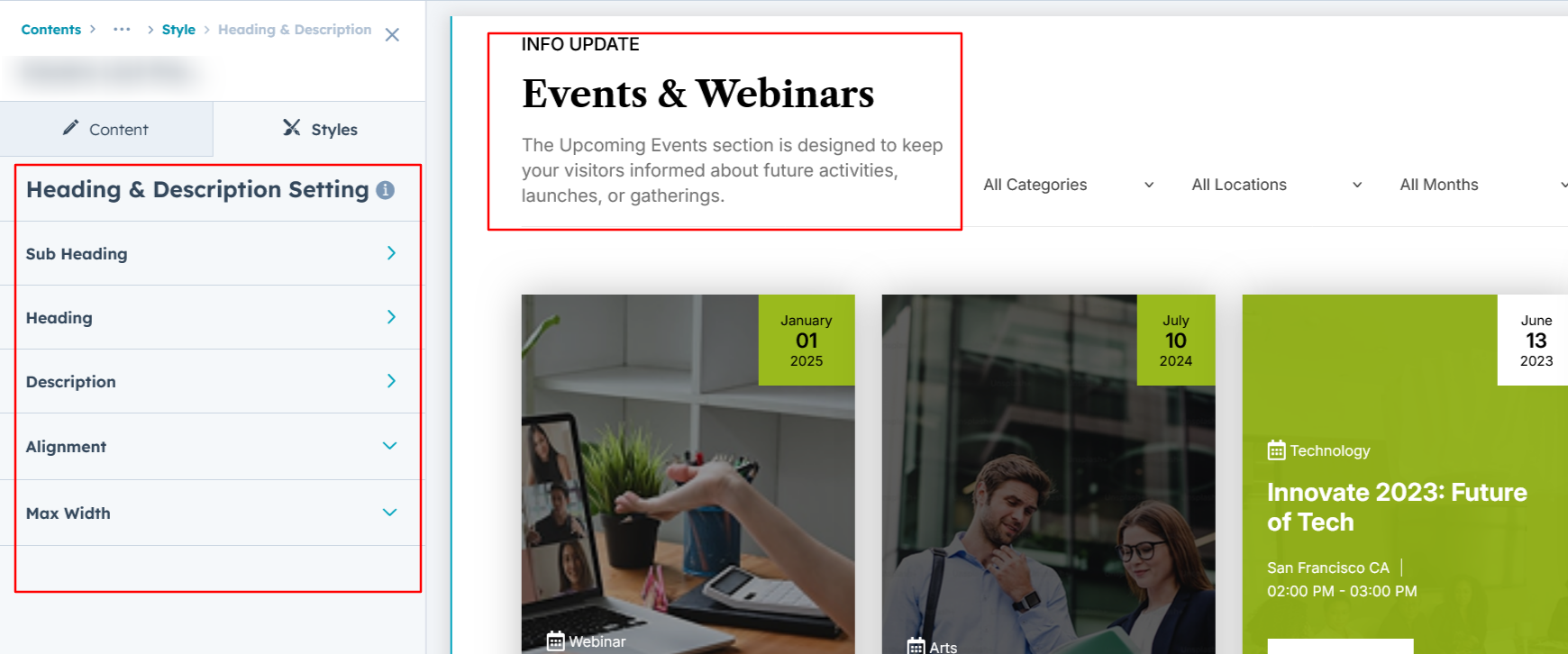 In this module, you have full flexibility to customize the heading and description to perfectly align with your design vision. You can easily adjust the spacing around the text, apply text transformations such as uppercase or lowercase, define the maximum width for better content flow, and set the alignment (left, center, or right) to create the ideal layout. These options ensure your content remains visually balanced and responsive across all devices.