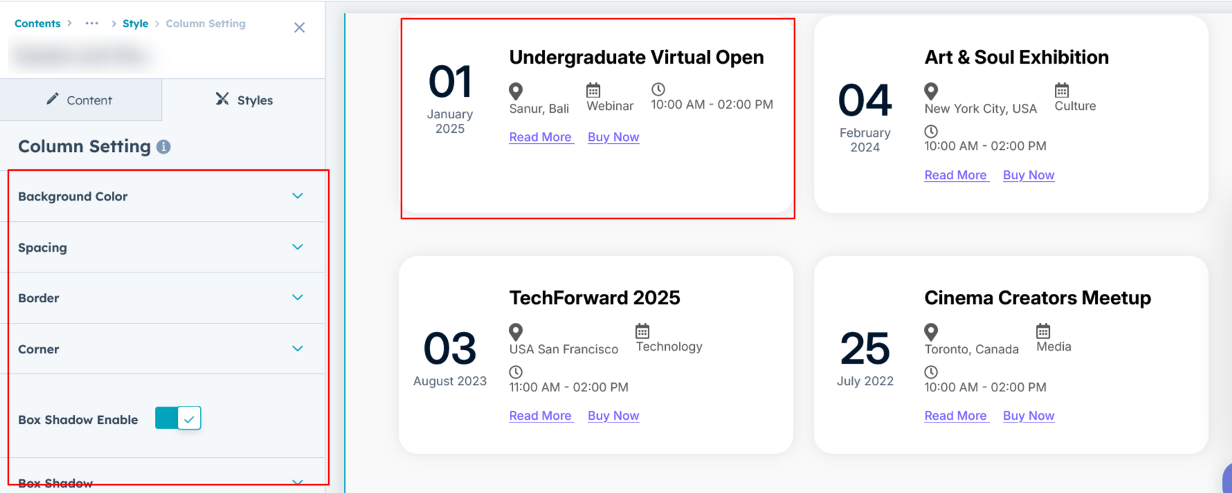 You have full control over customizing the column box to align with your design preferences. Adjust the background, spacing, border, corners, and box shadow to create the perfect look for your layout. Tailor these elements to ensure your content stands out and blends seamlessly with the rest of your design.