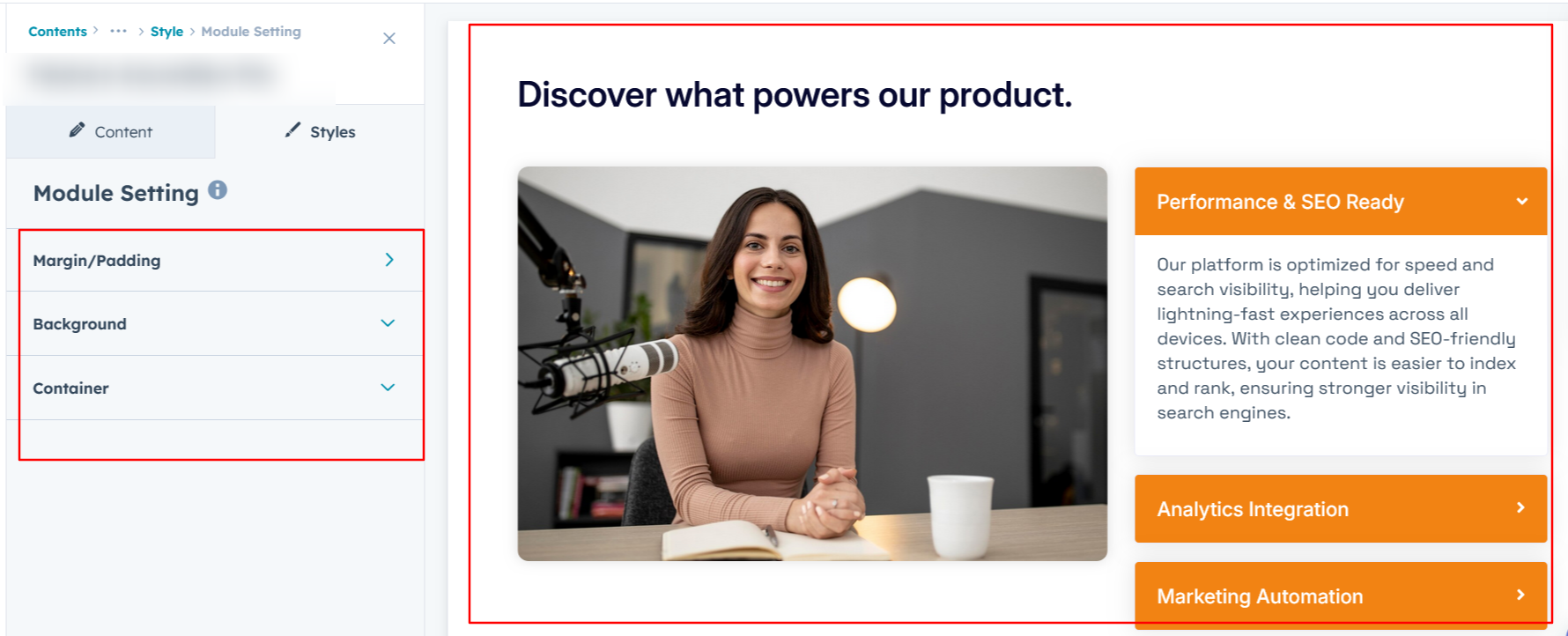 Adjust the margin, padding, container width and background colors to achieve your desired look and feel for the module. This flexibility lets you fine-tune the layout and aesthetics, ensuring your design is both visually appealing and user-friendly.