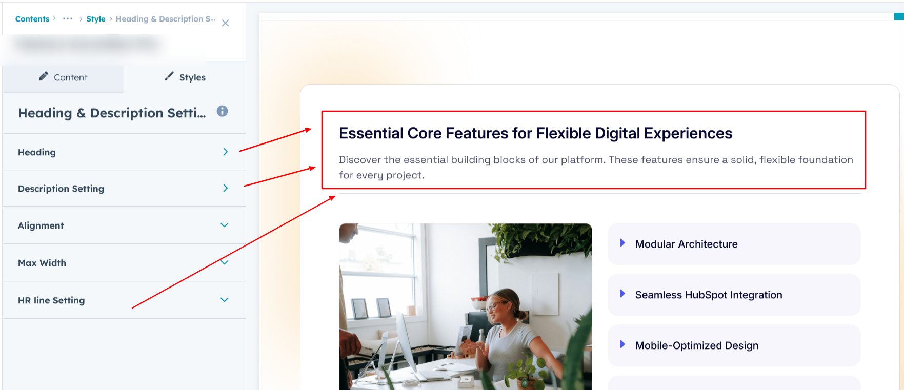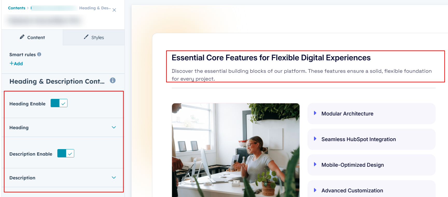 Toggle the supporting description on or off. Useful when you want only the heading without extra text. - Enter Description