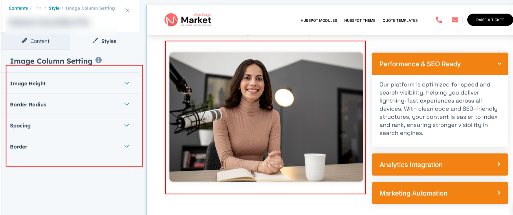 The Image Column Setting gives you complete control over how your visuals appear in the accordion module. You can adjust the image height to maintain consistent proportions, apply border radius for modern rounded edges, fine-tune spacing to create balanced layouts, and customize the border style, width, and color to frame your visuals. These options ensure your image or video blends seamlessly with the overall design while staying aligned with your brand style.