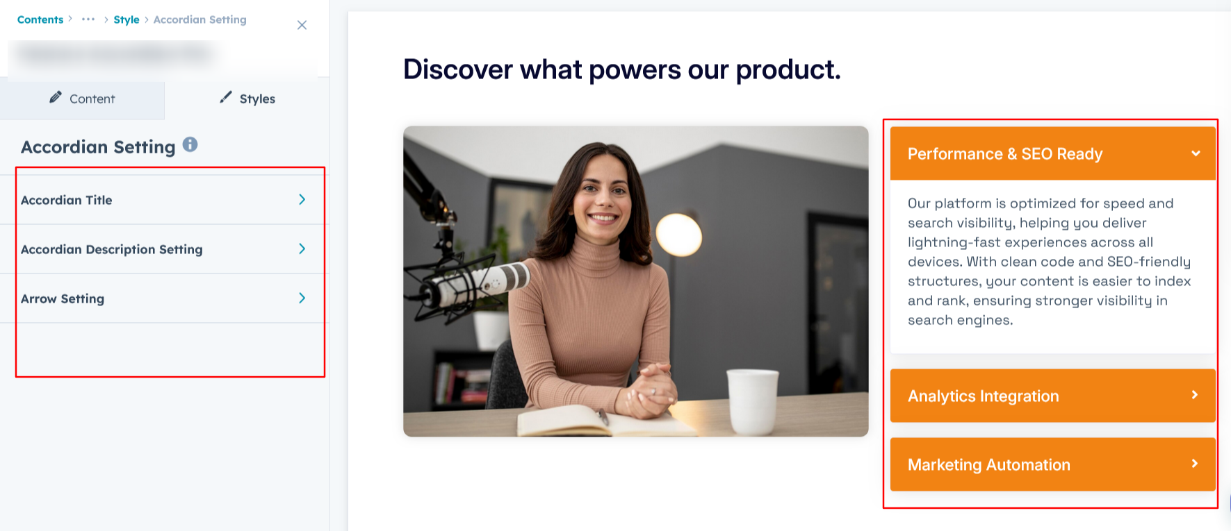 Customize the style of the accordion titles, including font, size, color, and spacing. Ensures headings are clear and match your brand. - Accordion Description Setting