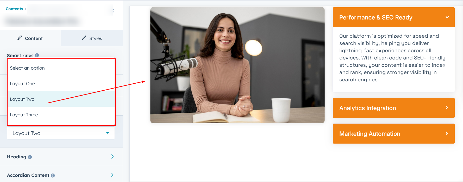 Layout 3 – An advanced layout with accordion content on the left and dynamic feature lists or supporting visuals on the right.