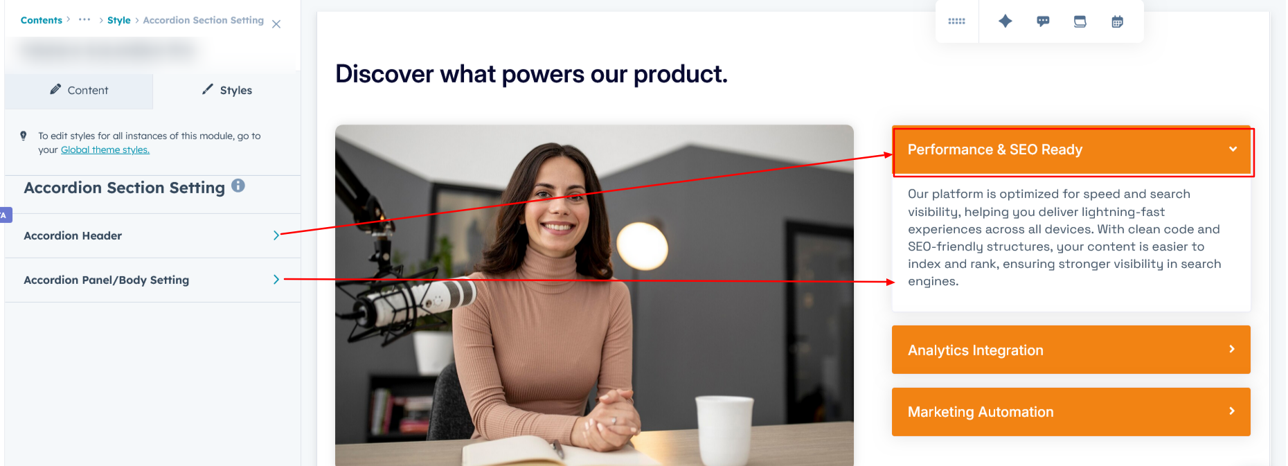 Control the appearance of the accordion content area with typography, color, and spacing options. Perfect for making text easy to read and engaging. - Arrow Setting