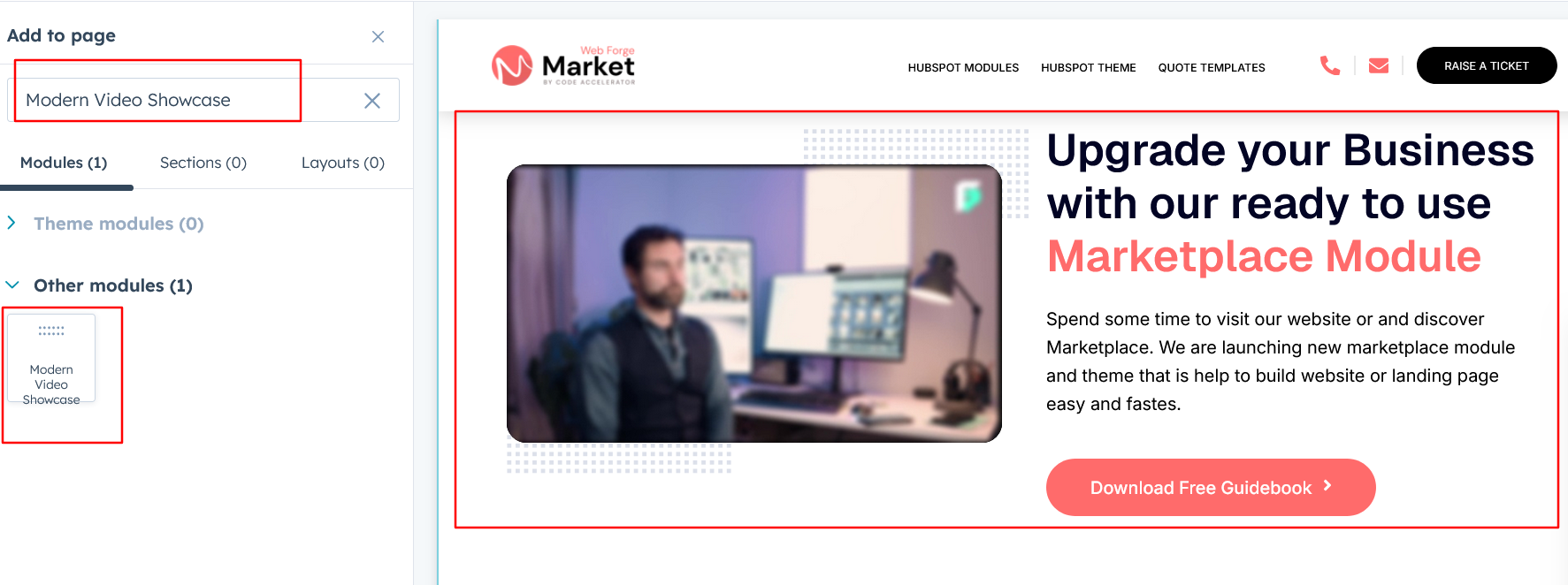 Search for "Modern Video Showcase" and drag and drop the module into the desired location on your page.