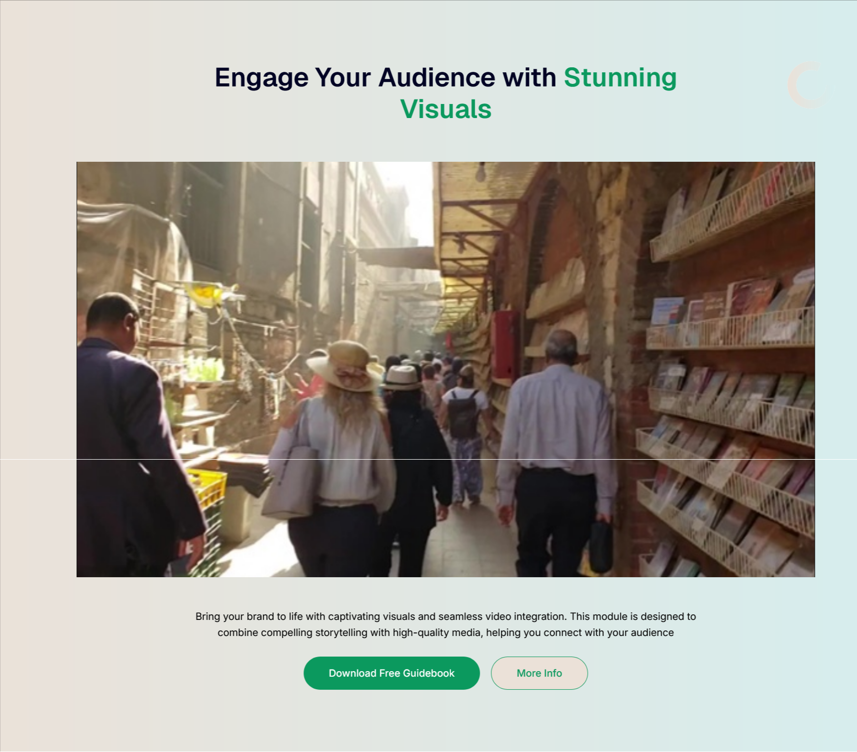 The Modern Video Showcase Module allows you to highlight your story, product, or service through stunning video integration combined with engaging content. Designed with flexibility and brand consistency in mind, it offers multiple layout options, customizable typography, and CTA buttons to drive user action. The module ensures smooth video playback with content, responsive design, and advanced controls for performance optimization. Perfect for landing pages, product launches, or storytelling sections, it blends video with impactful messaging to capture audience attention across all devices.