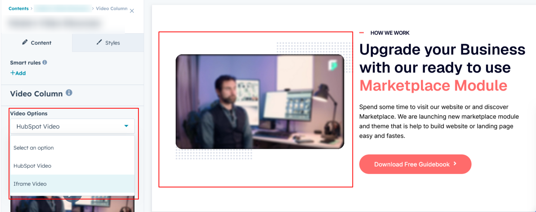 Choose between HubSpot Video or iFrame embed. Perfect for flexibility when using hosted content or external platforms like YouTube and Vimeo. - Play Button Color