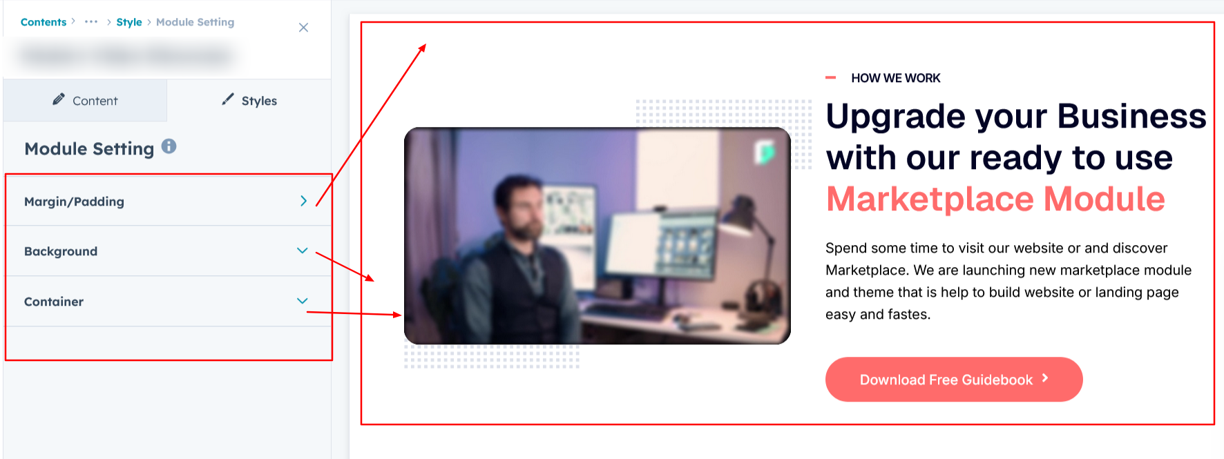 Adjust the margin, padding, container width and background colors to achieve your desired look and feel for the module. This flexibility lets you fine-tune the layout and aesthetics, ensuring your design is both visually appealing and user-friendly.