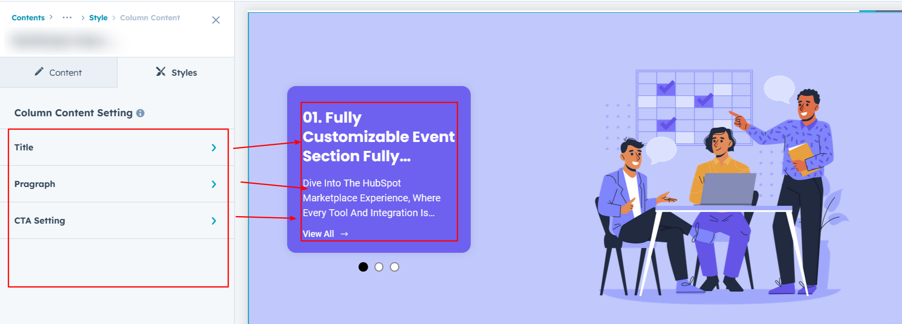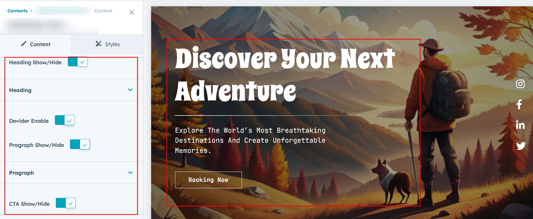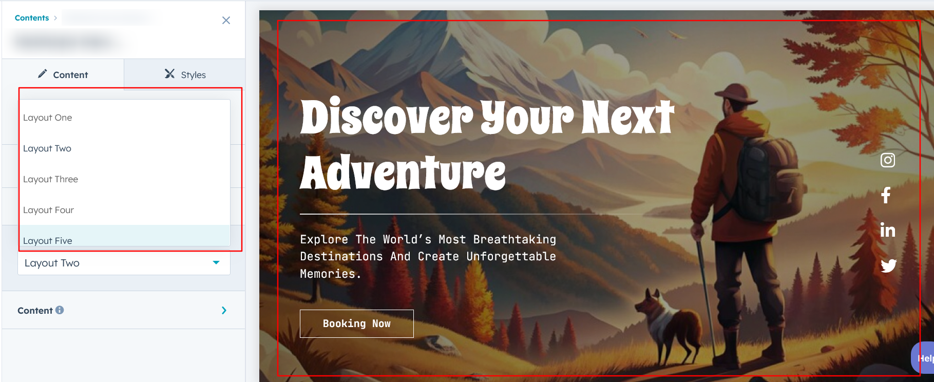 In Layouts 2, 3, 5, and 6, you can customize the content title, description, and CTA text with links. Additionally, in Layout 4, you can modify the column content to suit your needs. Layout 2 also includes options to add and customize social icons with links.