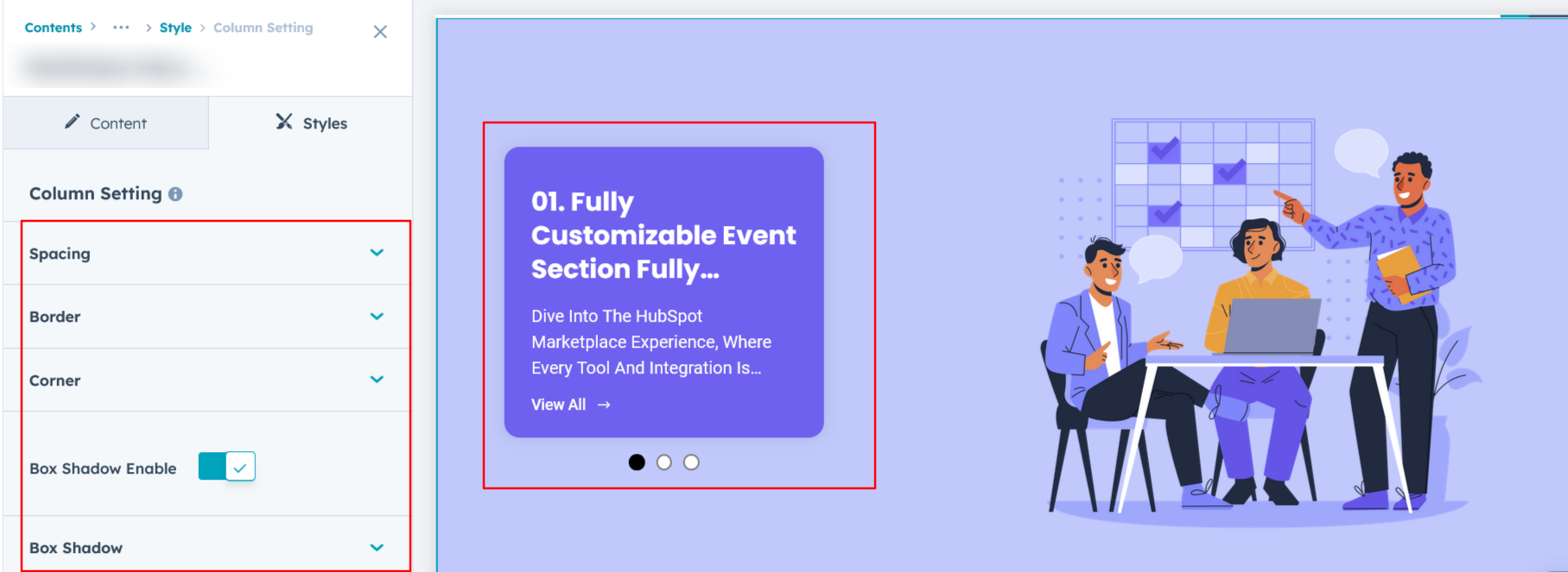 For Layout 1, users can customize the spacing of the left slide column, as well as adjust the border, border radius, and box shadow to achieve their desired design style.