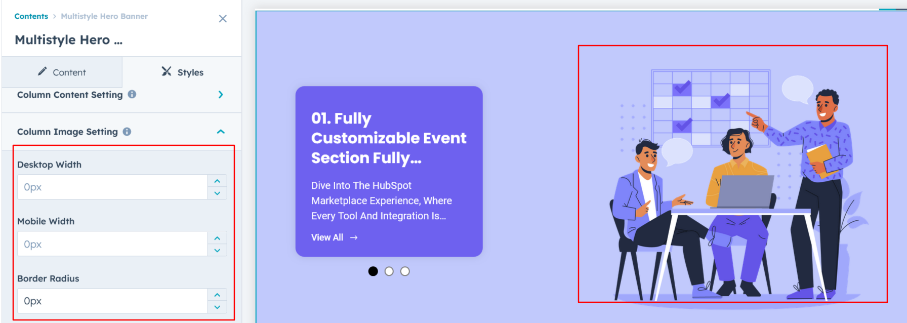 In Layouts 1 and 5, users can customize the column image width for both desktop and mobile views, as well as add a border radius for a polished and tailored design.