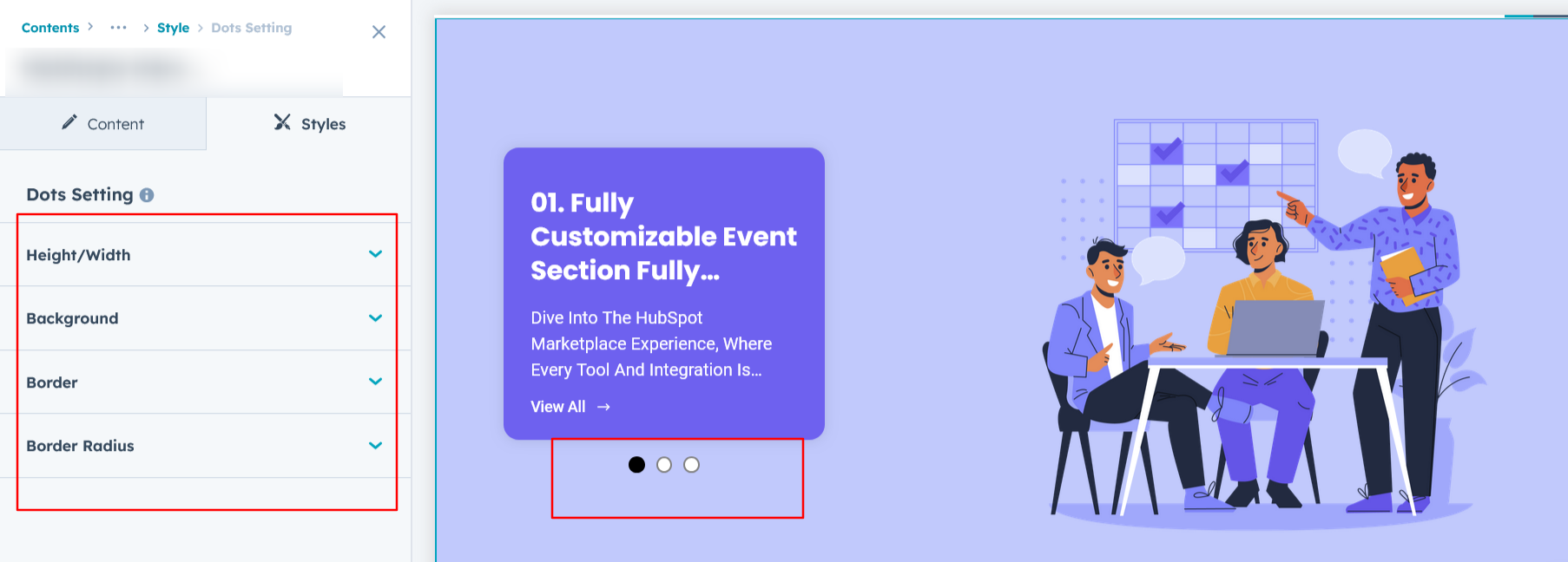 In Layout 1, users can customize the dots' height and width, background colors, border, border radius, and also set a unique background color for the active dot.