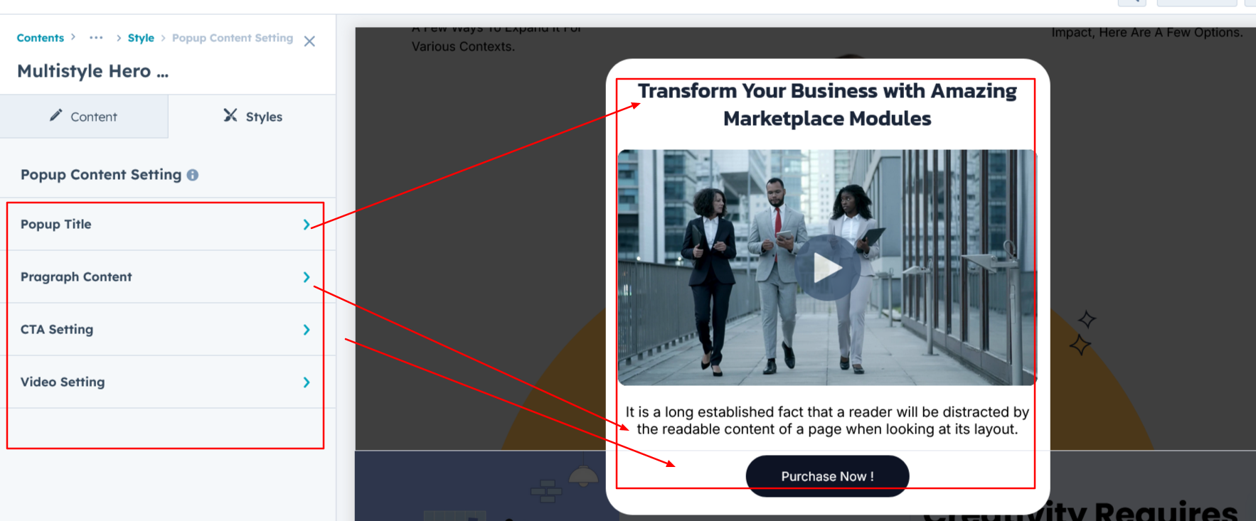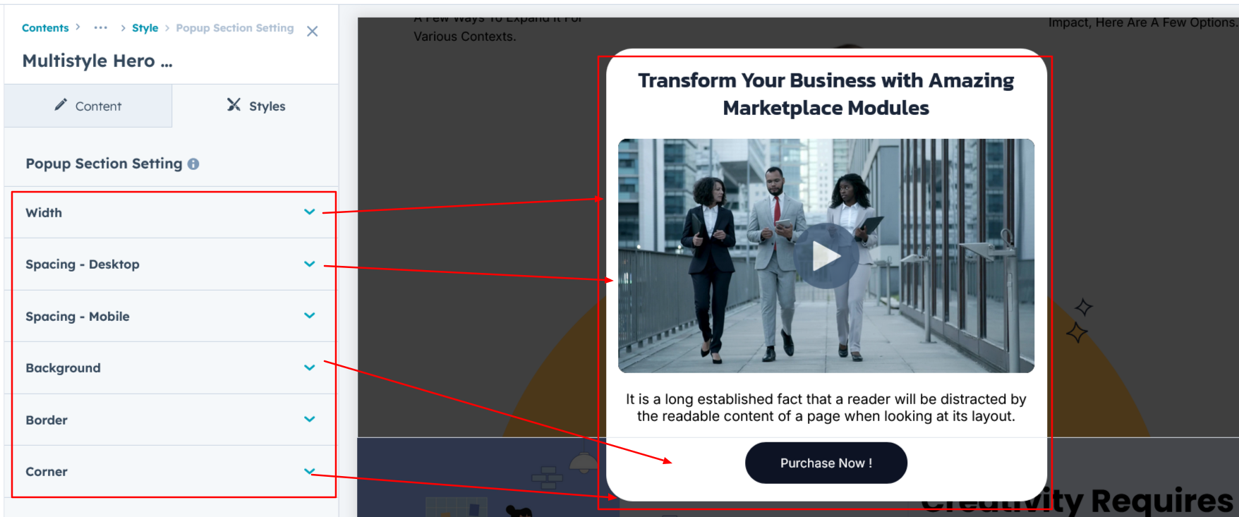 In Layouts 3 and 4, users can customize the popup title, description, and CTA typography, including font size, color, spacing, text transformations, and alignment. Additionally, users can adjust the video spacing and corner styling for a tailored appearance.