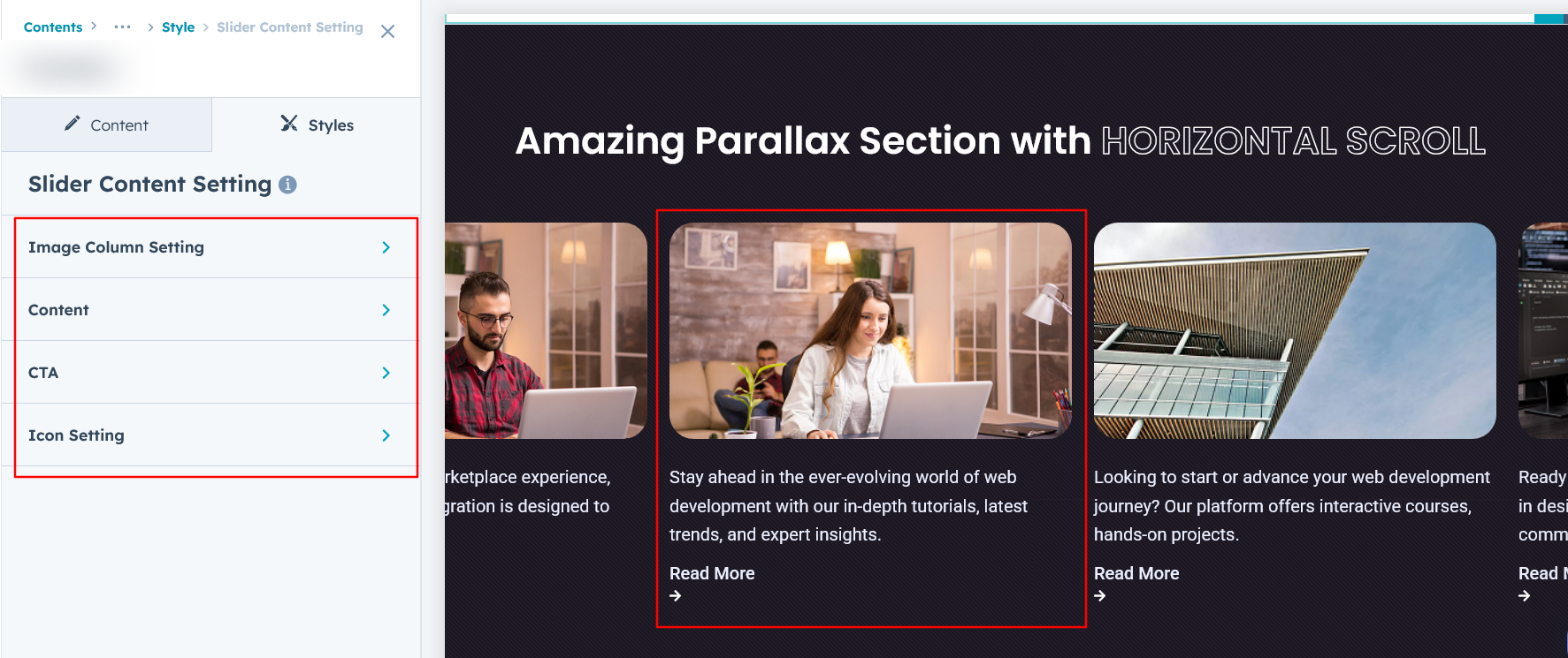 Easily customize image and content typography, adjust image height, spacing, and corner options. Set typography for content, configure CTAs, and add icons for a personalized design.