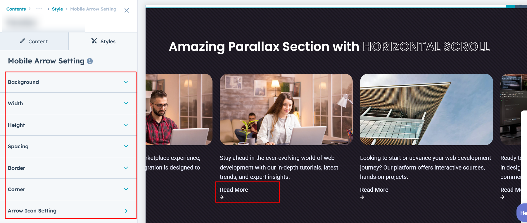 In this layout, you can customize the mobile arrow's image size, background, spacing, border, and corner options. These features are available in Layout 2.
