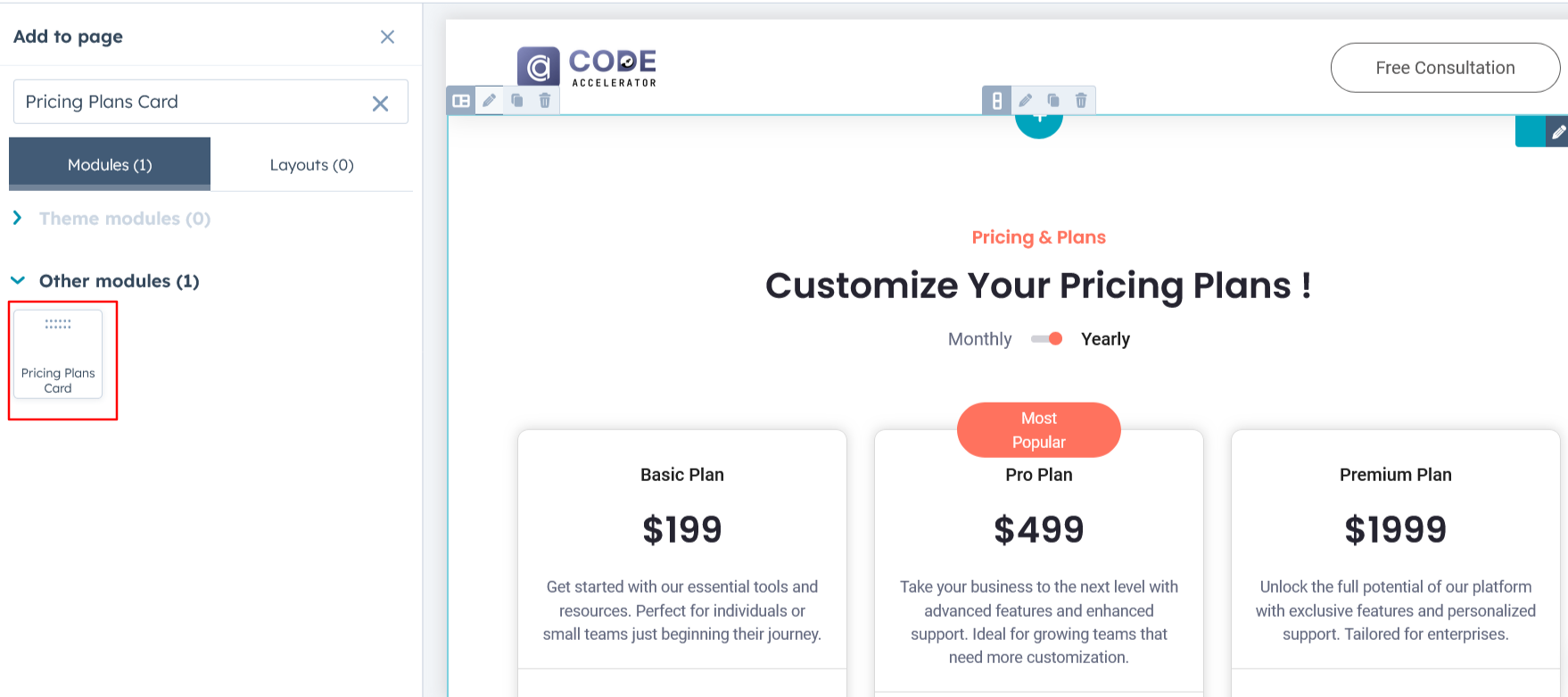 We hope you enjoy using our pricing module to create a seamless experience for both your users and your marketing team. At Code Accelerator, we're committed to ensuring your HubSpot experience is exceptional. If you need a custom HubSpot module or require a tailored HubSpot CMS or CRM setup, please don’t hesitate to Contact Us.