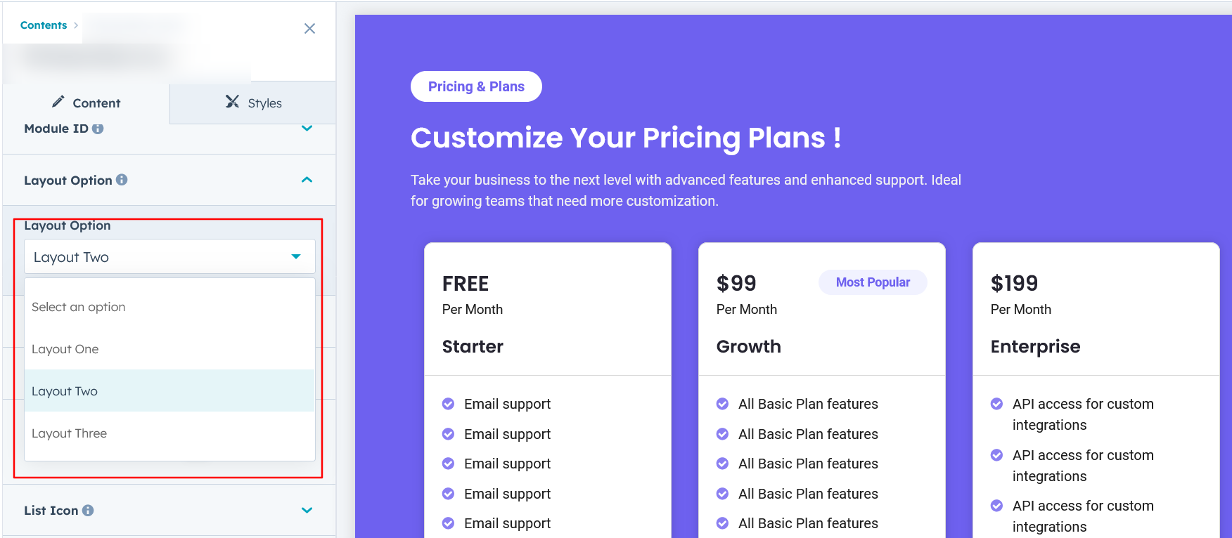 - Layout 2 : This layout showcases features alongside a single pricing option, with an optional dark background for enhanced visual appeal.