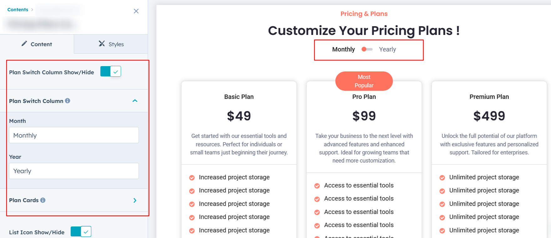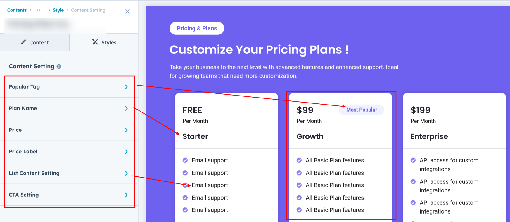 You can customize the plan's price, name, description, and features. Additionally, highlight Plan 2 with a 'Most Popular' tag and include a show/hide option for the CTA button to enhance user interaction.