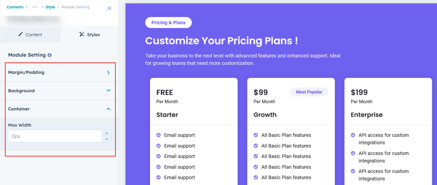 Adjust the margins, padding, background colors, and container width to achieve your desired look and feel for the module. This flexibility allows you to fine-tune the layout and aesthetics, ensuring that your design is not only visually appealing but also functional and user-friendly.