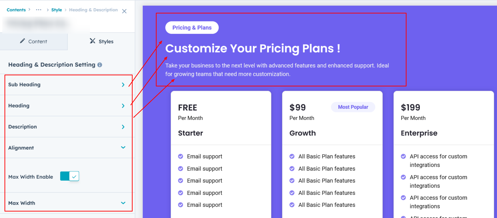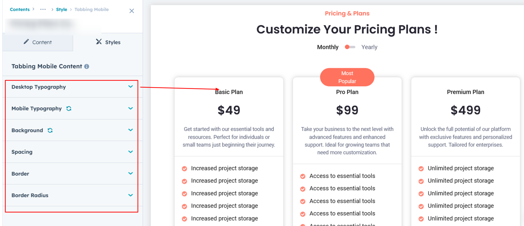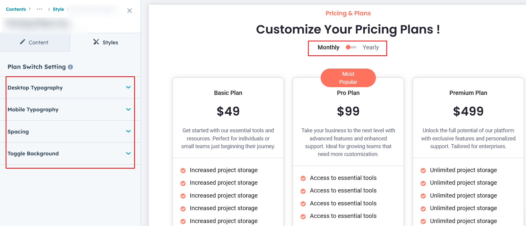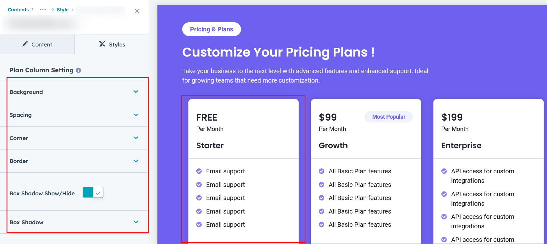 Users have the flexibility to customize the plan column spacing for both desktop and mobile views. Additionally, you can modify the background color, set borders and border radii, and apply box shadows to enhance depth and visual appeal.
