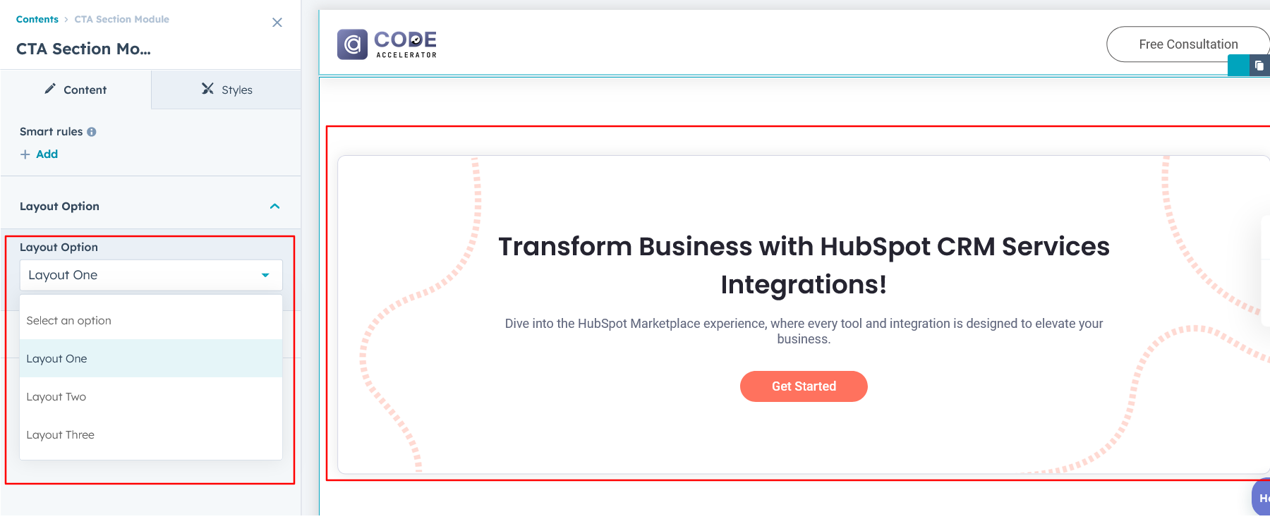 For the CTA module section, select your preferred layout (e.g., Layout 1, Layout 2 & Layout 3) and easily rearrange it to achieve the ideal content flow.