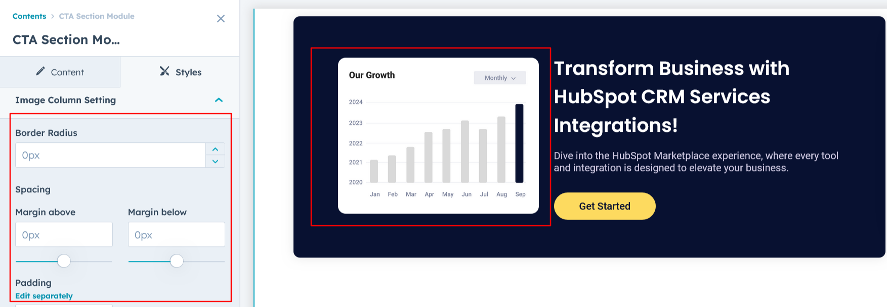 For Layout 3, you can customize the image settings by adjusting the border radius, spacing. This allows for a tailored look that complements the overall design of your CTA module.