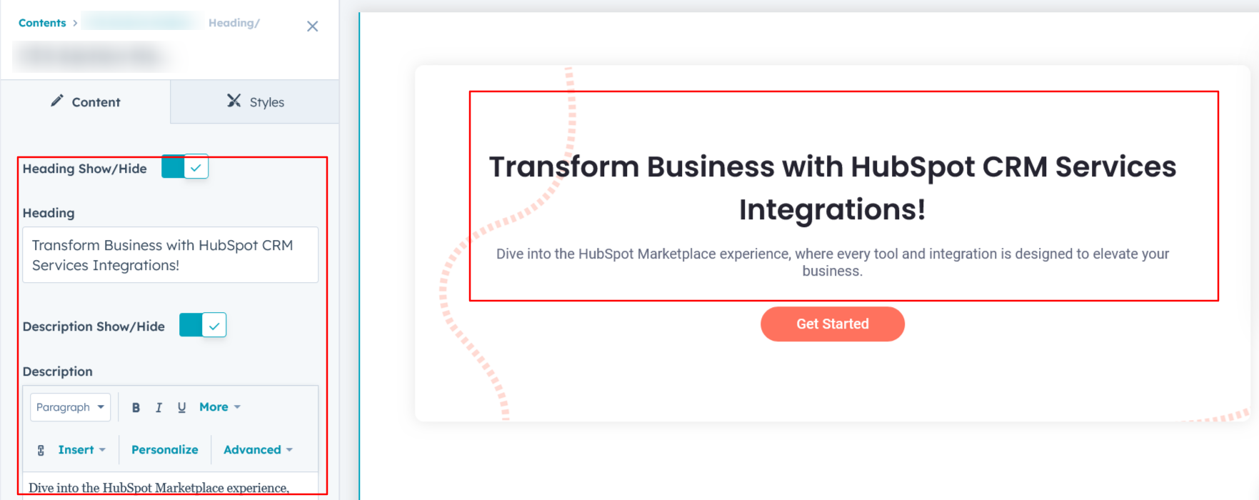 You can easily customize the content in your CTA module's heading sections to suit your needs. Adjust the 'Heading' and 'Description' to align with your specific messaging, or choose to hide these sections entirely if desired.